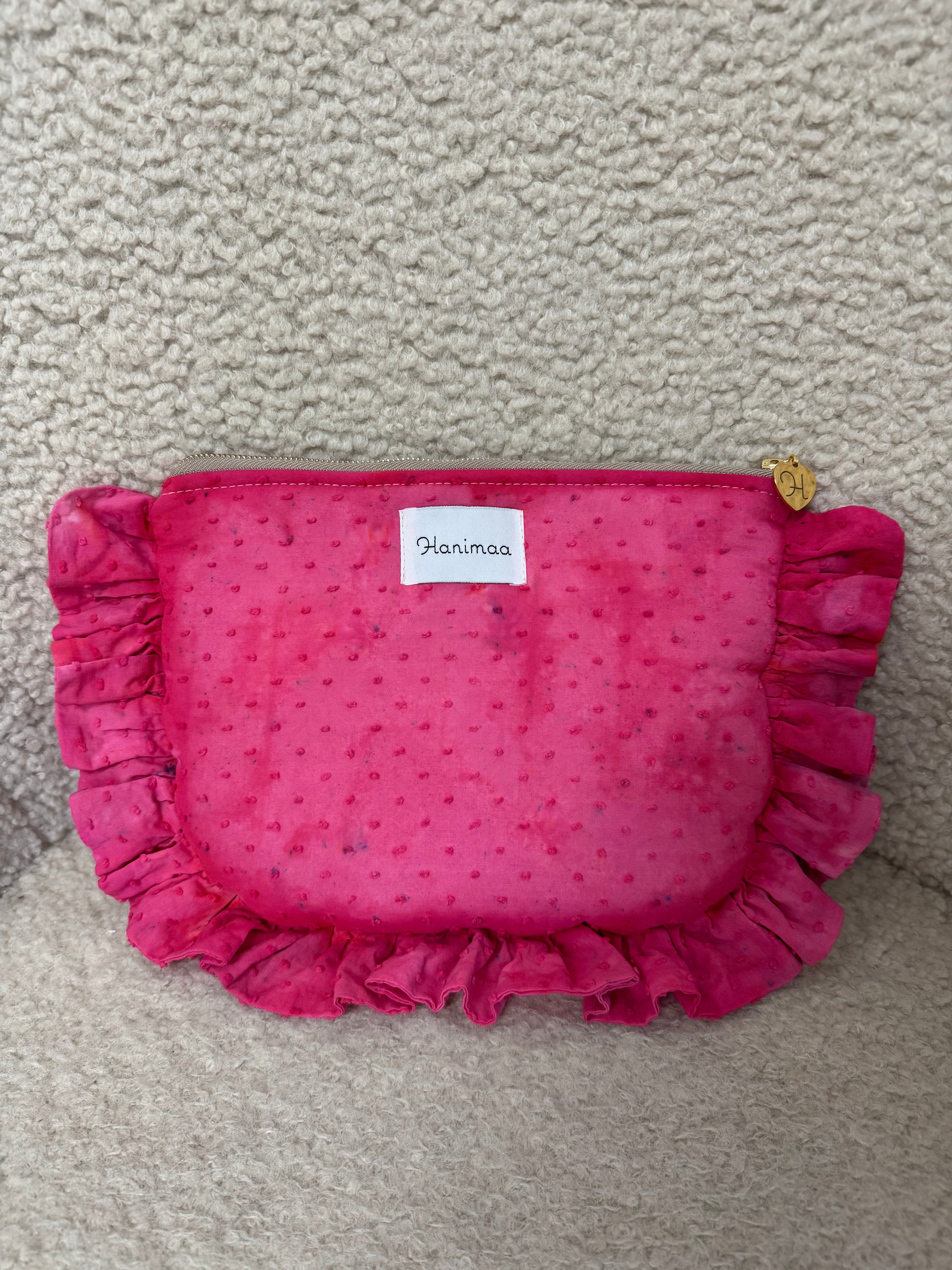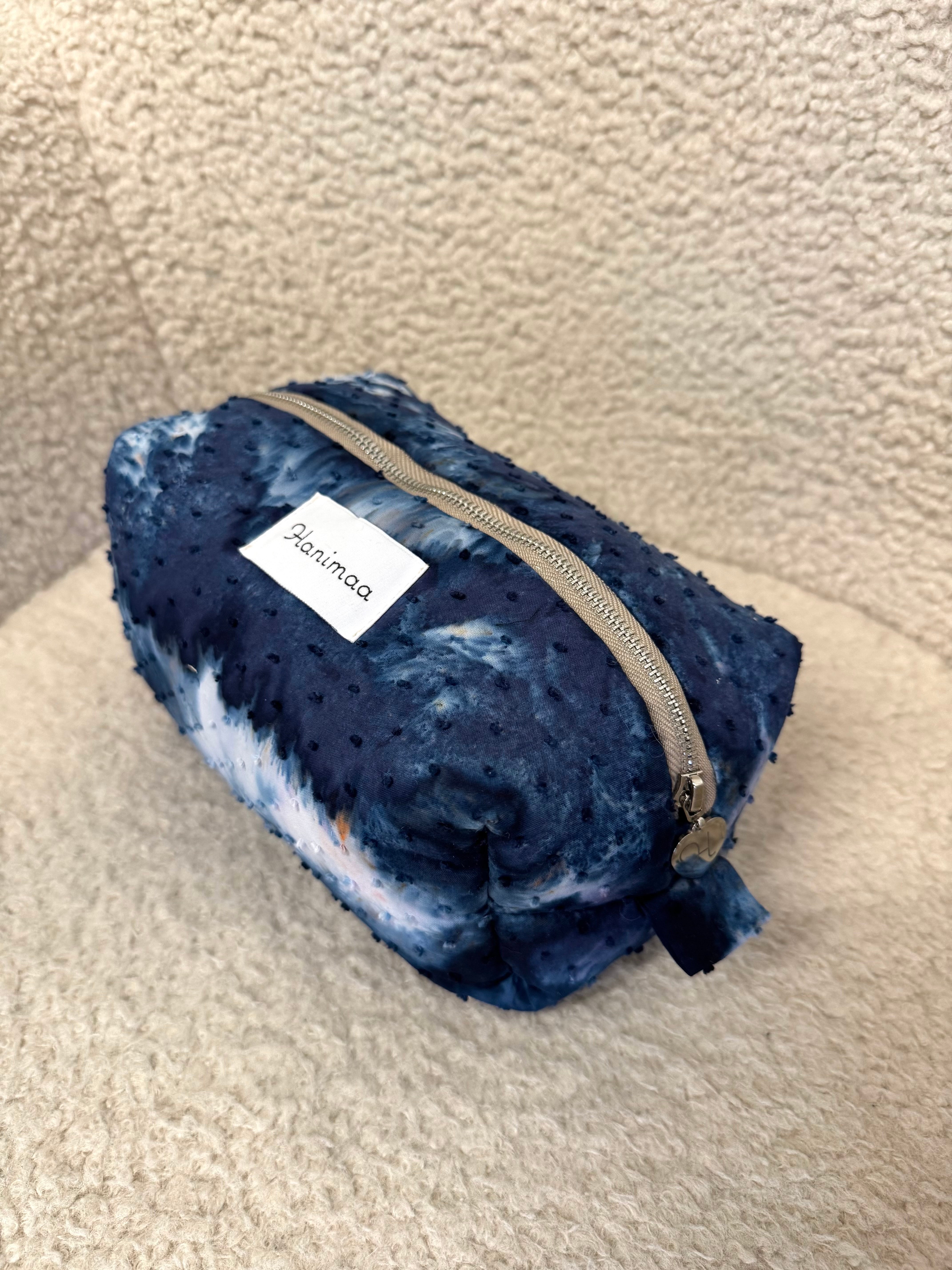 Jokainen Hanimaan meikkilaukku ja toilettilaukku on valmistettu pienessä erässä ja käsinvärjätty ainutlaatuiseksi. Värjäyksen elävä pinta ja tarkoin valitut kankaat luovat kauniin tekstuurin, joka tekee jokaisesta laukusta pienen taideteoksen arjen ja matkojen käyttöön. Kaikissa laukuissa on Hanimaan oma metallinen vetoketjuvedin, puuvillavuori sekä pehmustettu rakenne, joka suojaa kosmetiikkaa ja hygieniatarvikkeita matkalla tai kylpyhuoneen hyllyllä.