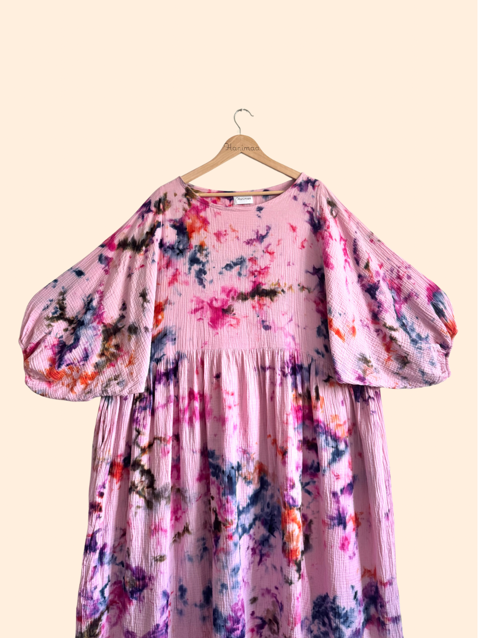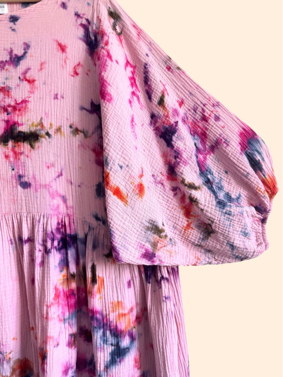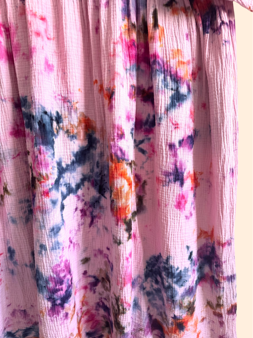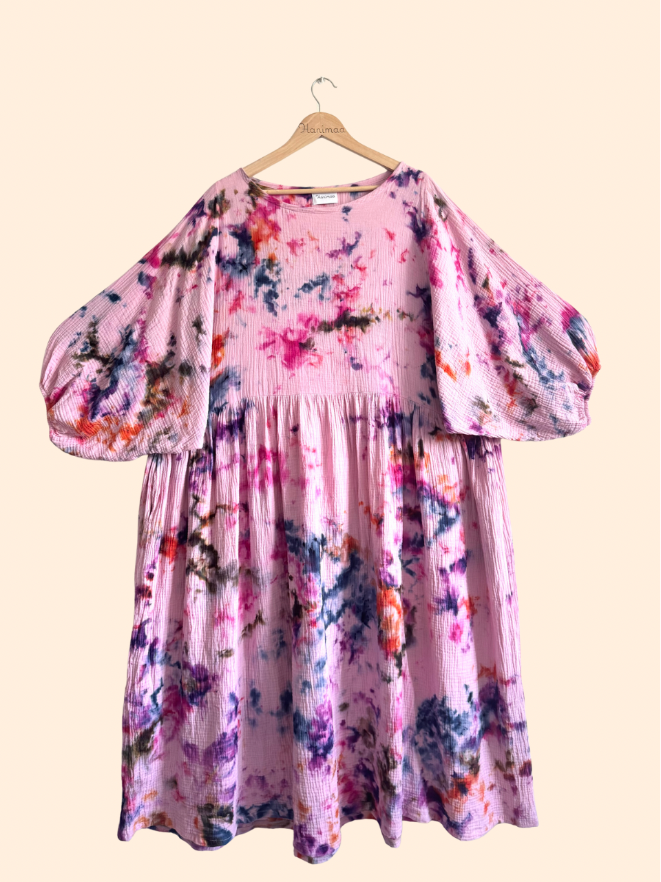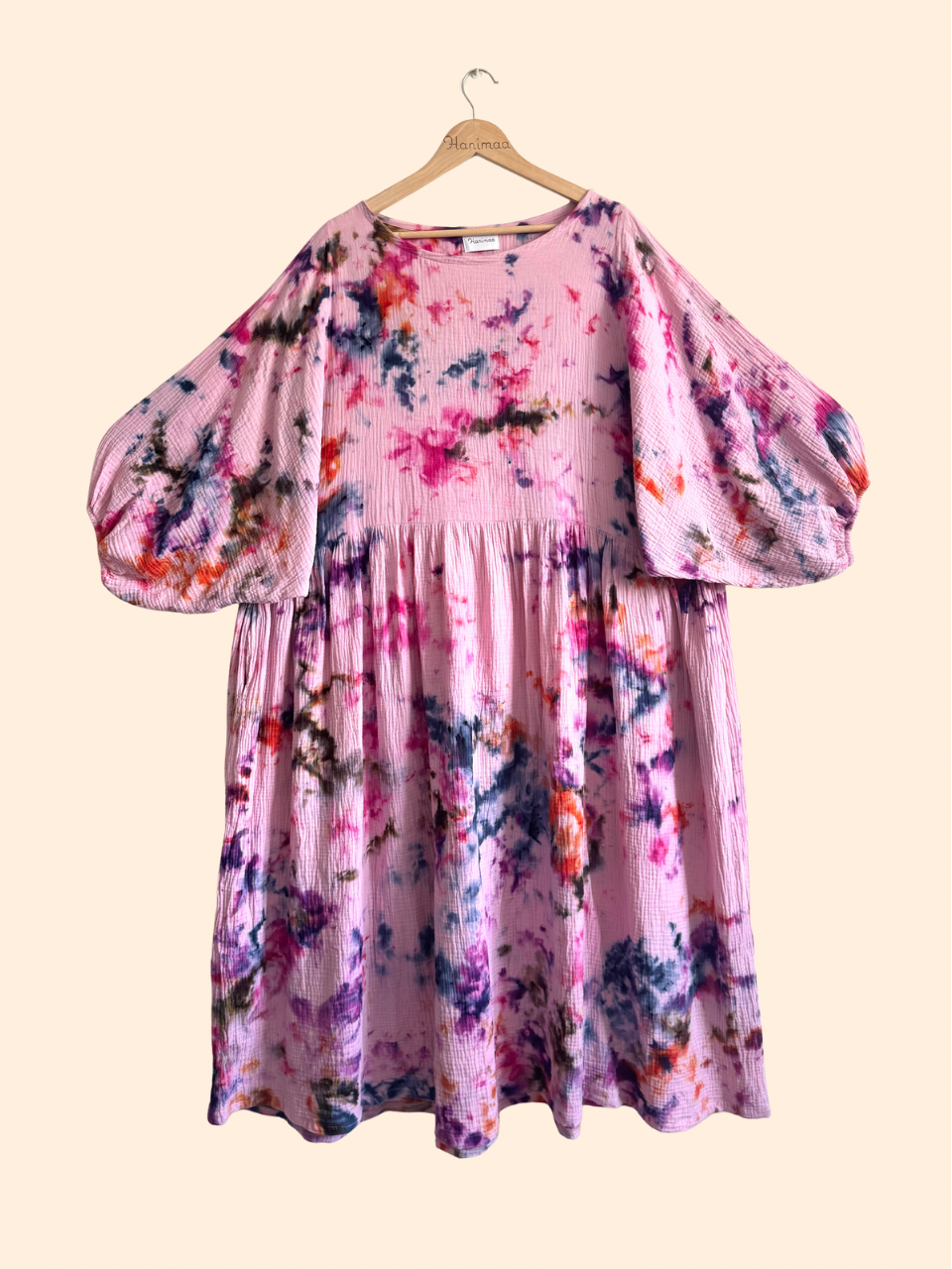 Aurora-mekko on ajaton ja ihanan kevyt boheemi mekko, joka hulmuaa kauniisti kesätuulessa ja liikkuu vapaasti mukanasi. Sen 100 % puuvillainen tuplaharsokangas eli musliinia joka on erittäin hengittävä, ilmava ja pehmeä ihoa vasten. Käsinvärjätty materiaali tuo jokaiselle mekolle uniikin värisävyn ja kauniin tekstuurin.