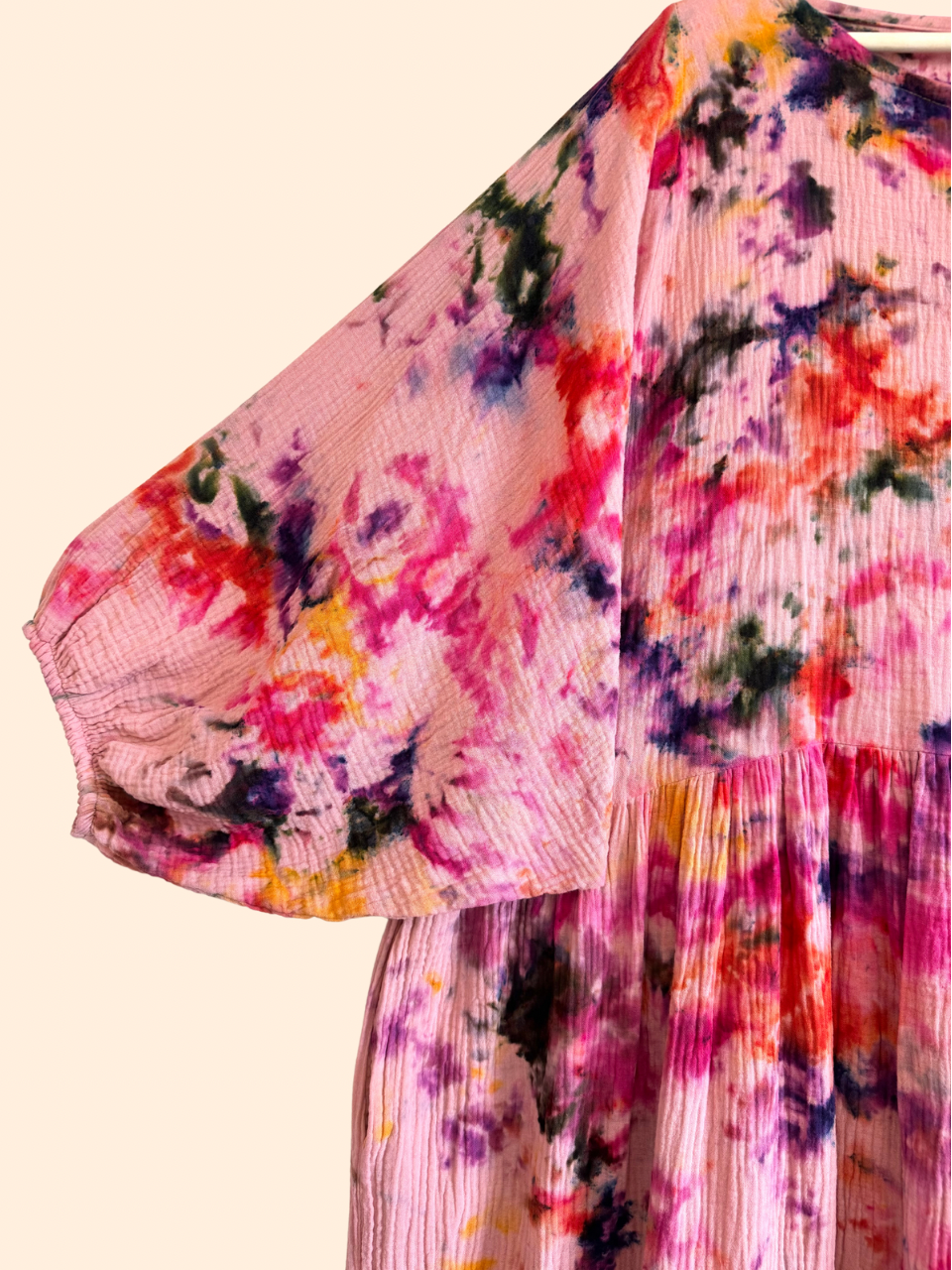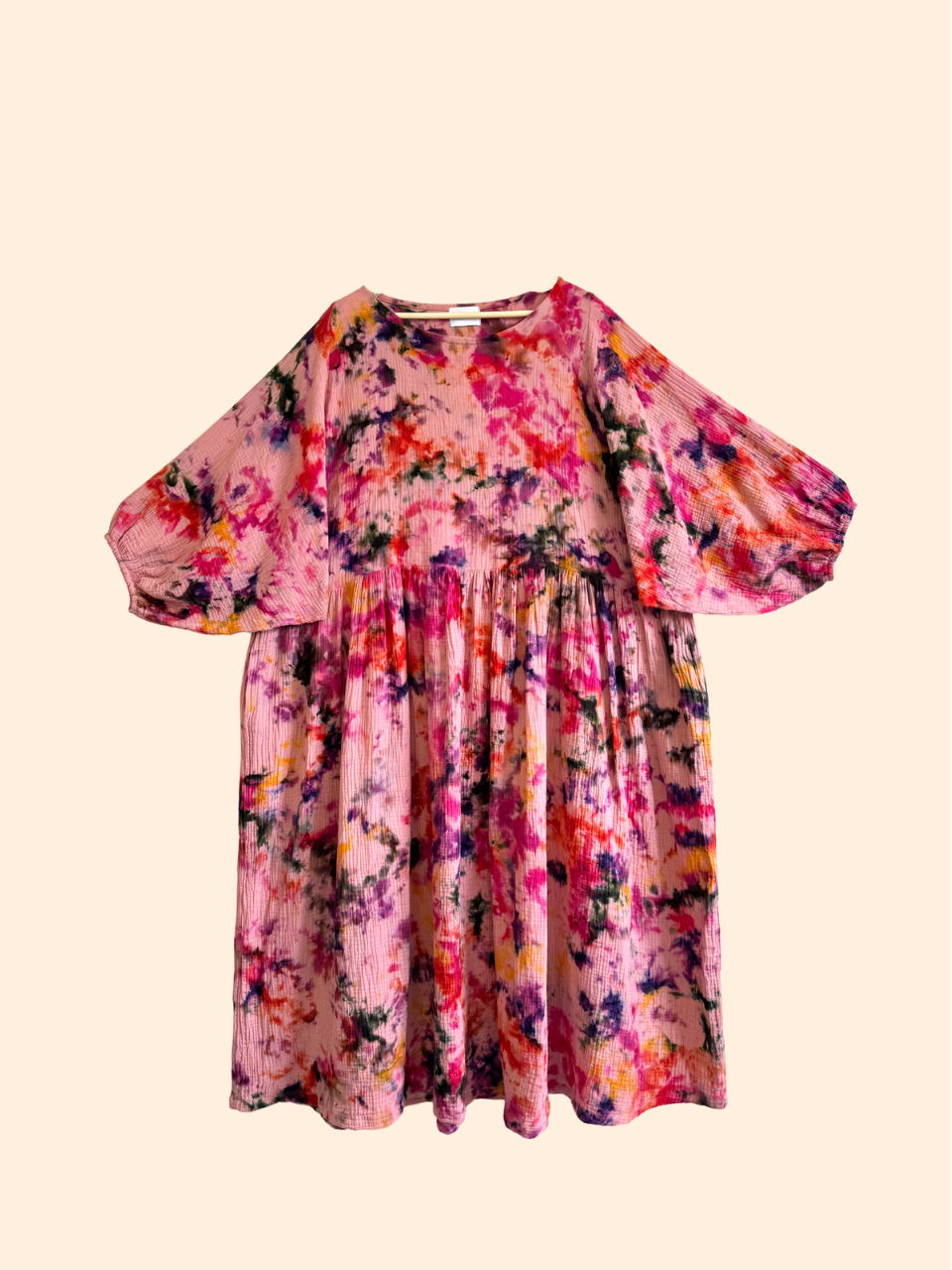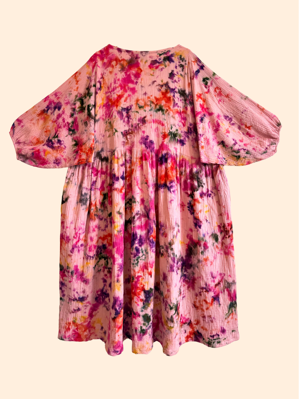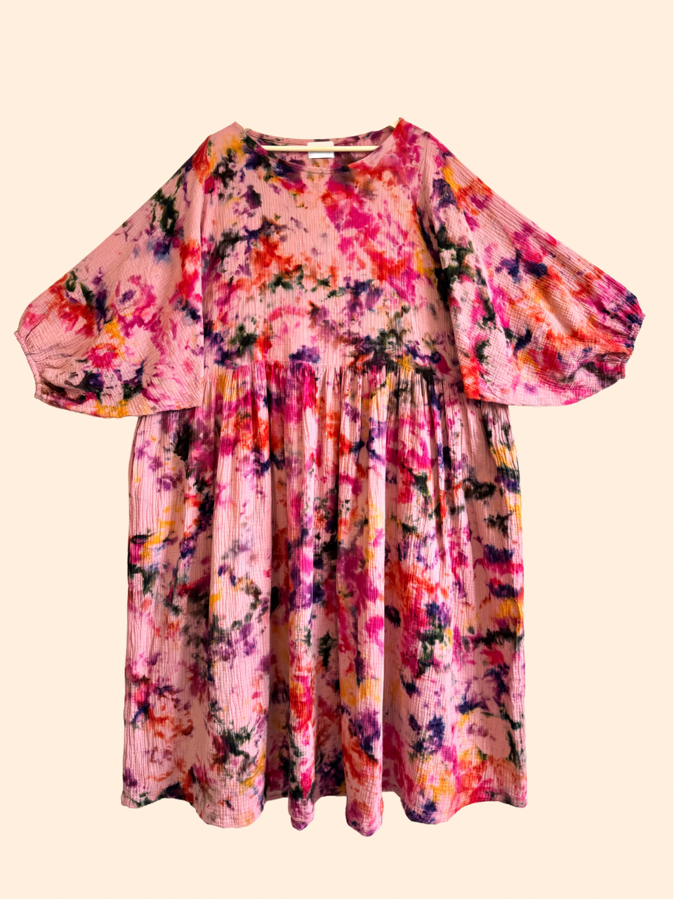 Aurora-mekko on ajaton ja ihanan kevyt boheemi mekko, joka hulmuaa kauniisti kesätuulessa ja liikkuu vapaasti mukanasi. Sen 100 % puuvillainen tuplaharsokangas eli musliinia joka on erittäin hengittävä, ilmava ja pehmeä ihoa vasten. Käsinvärjätty materiaali tuo jokaiselle mekolle uniikin värisävyn ja kauniin tekstuurin.