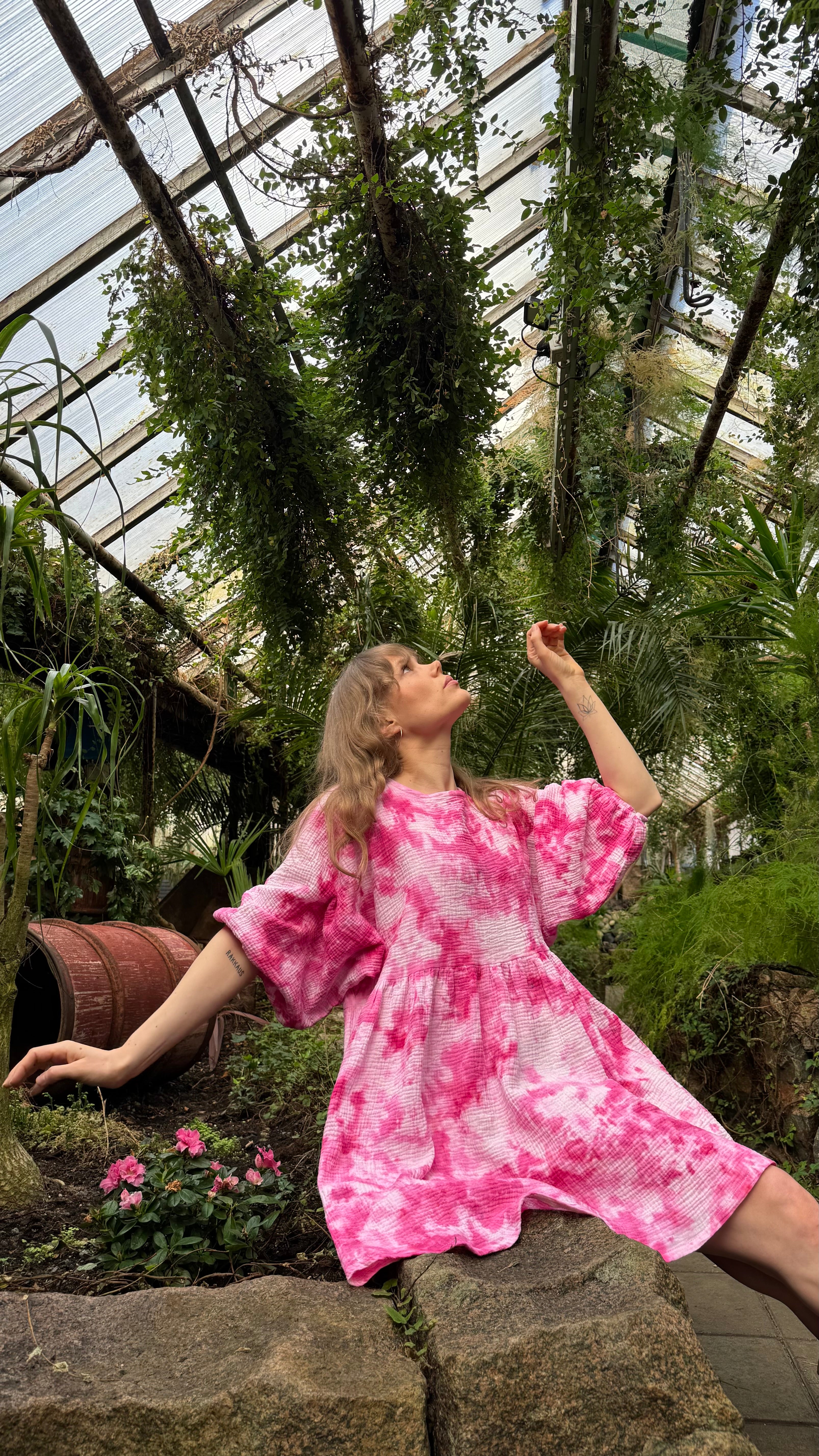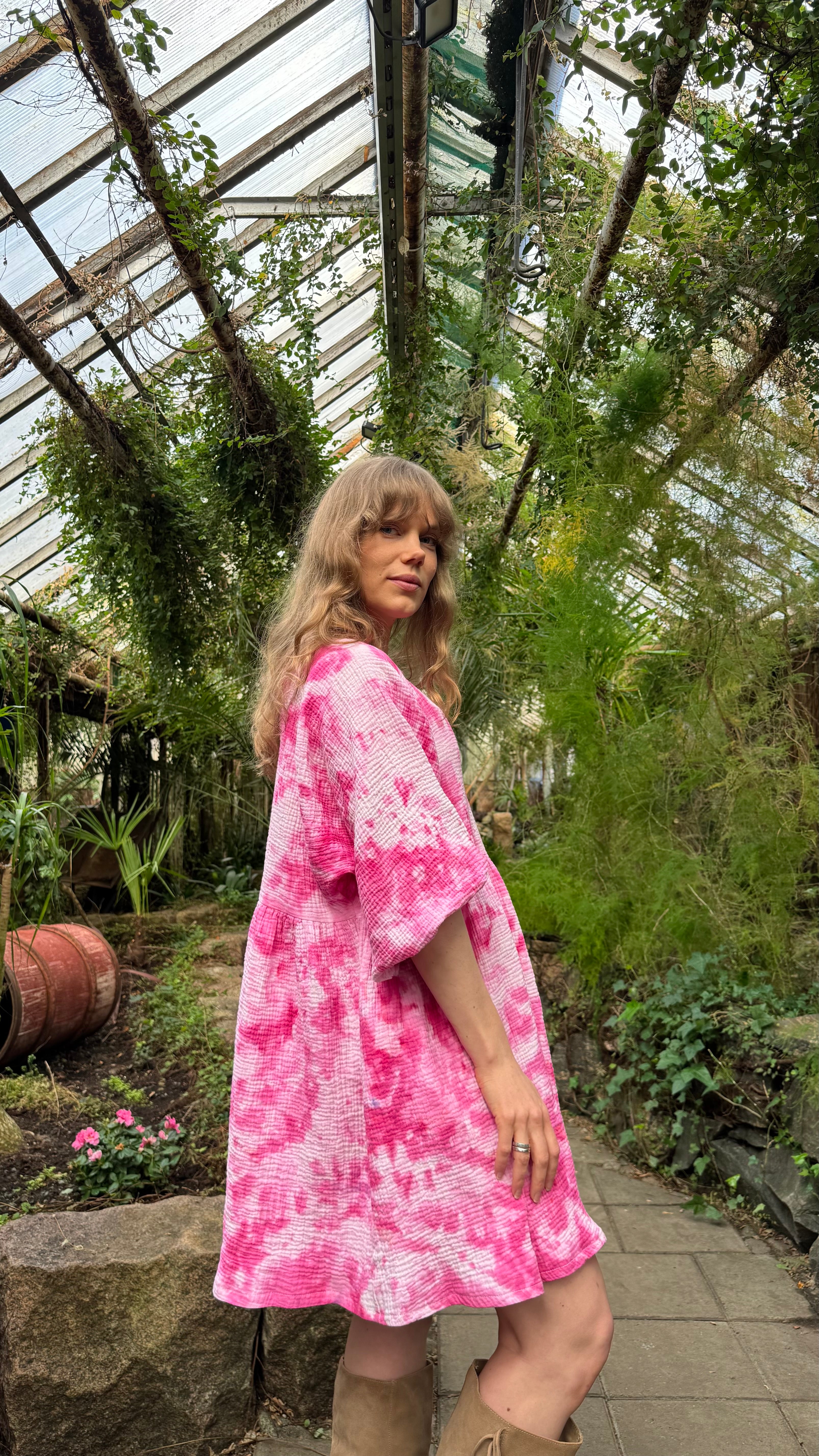 100 % puuvillainen tuplaharsokangas on hengittävä ja eläväpintainen. Käsinvärjäys antaa jokaiselle mekolle uniikin sävyn ja syvyyden, joka tekee siitä yksilöllisen ja katseita herättävän.