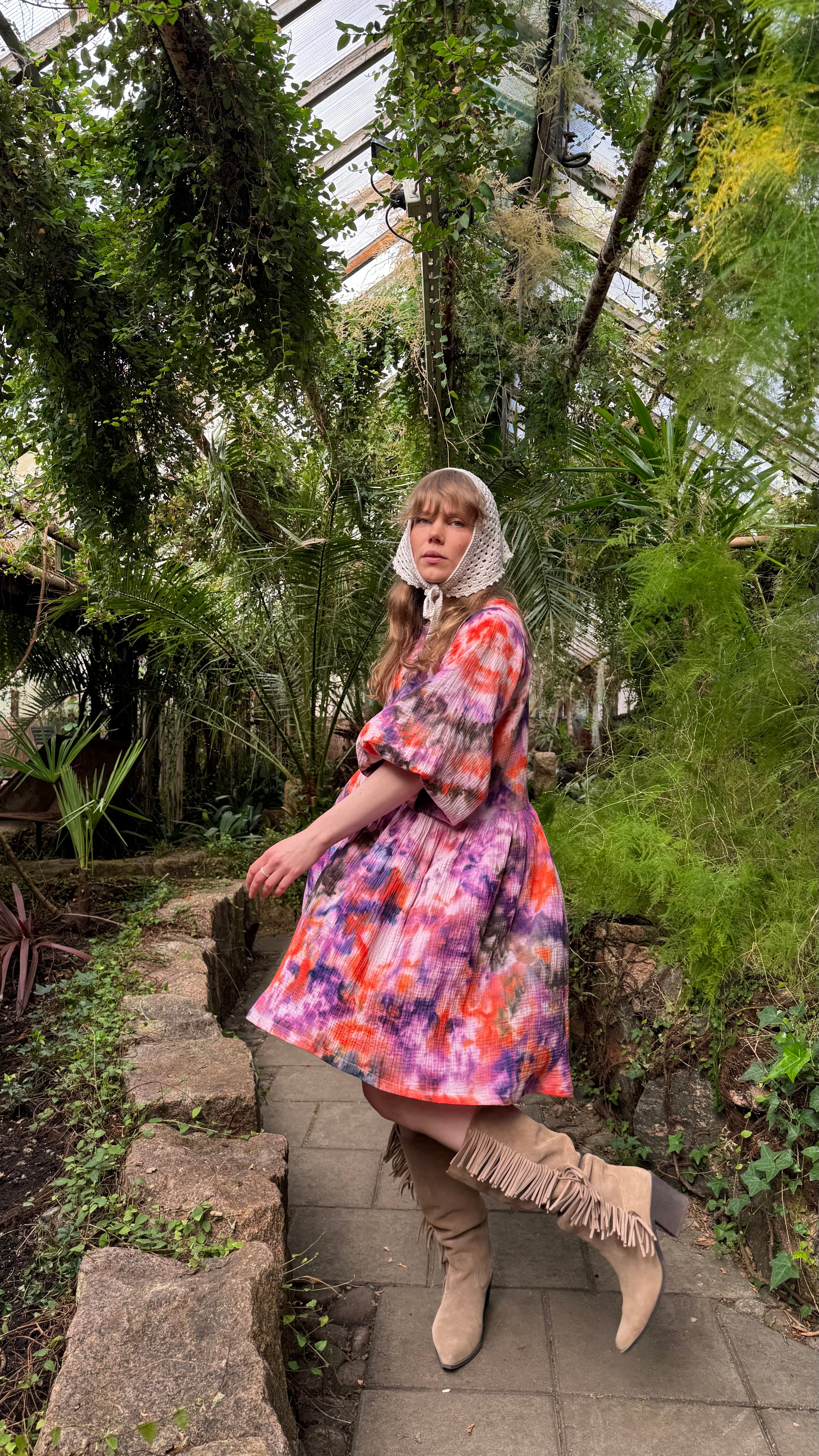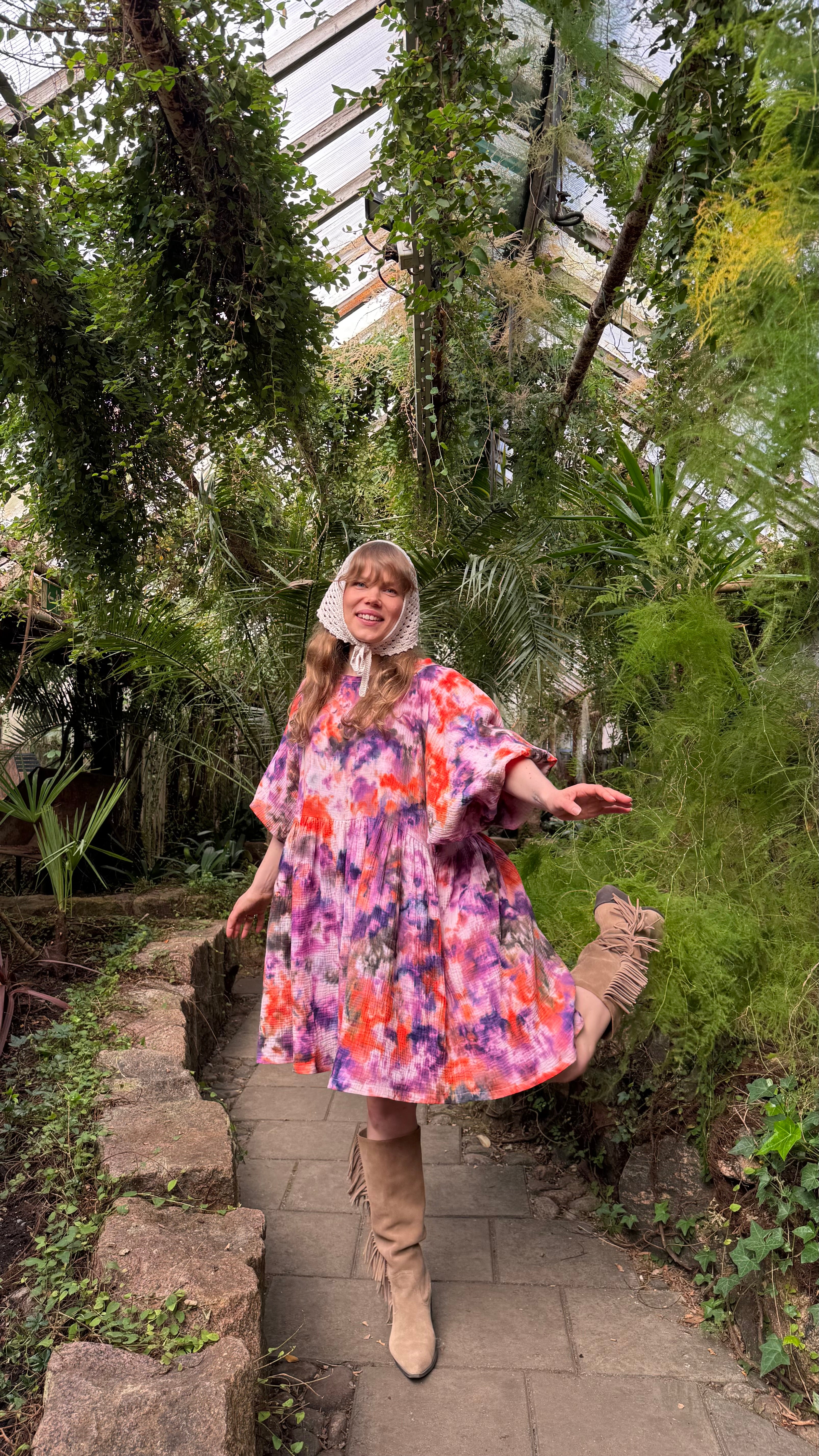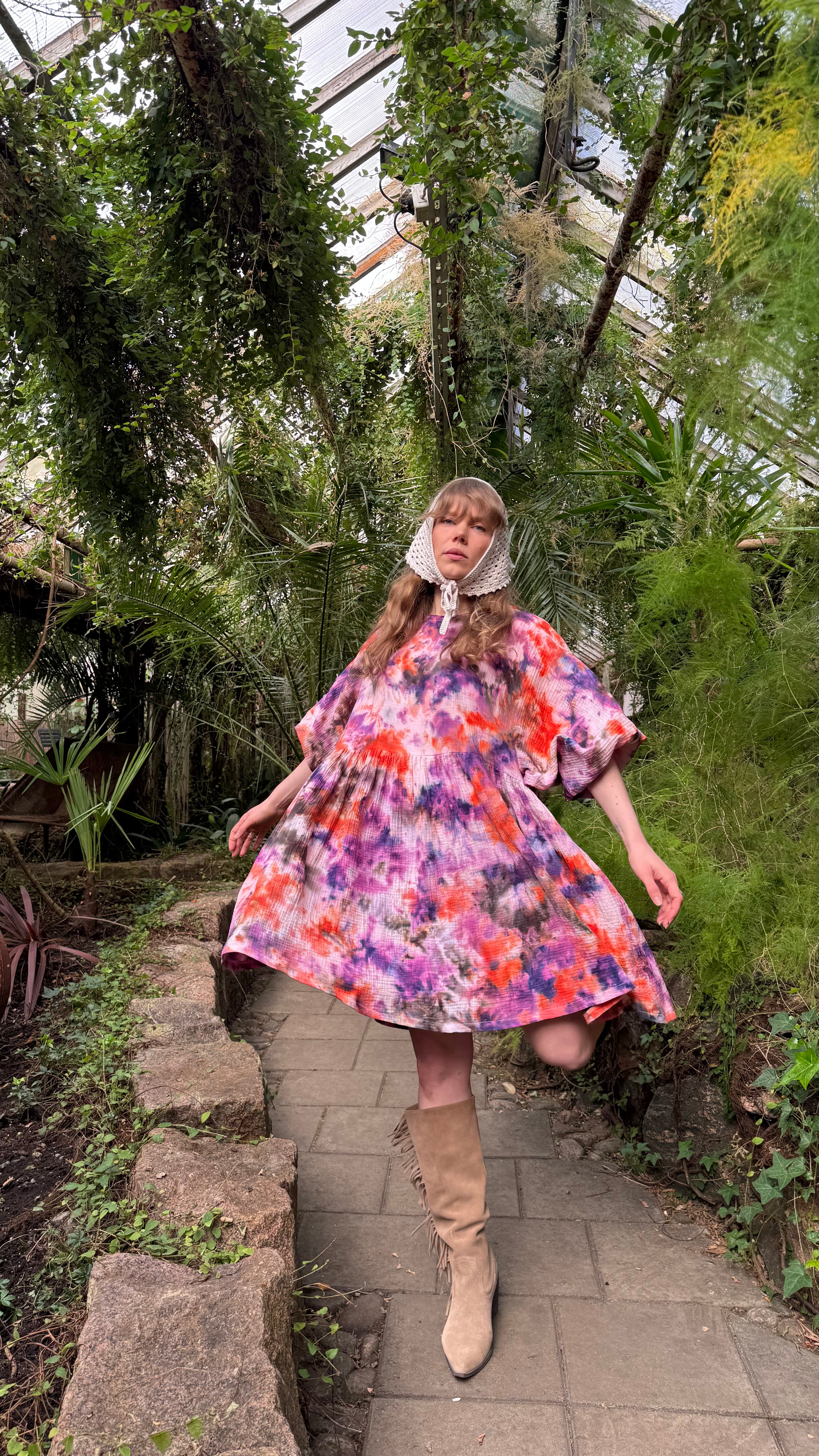 Aurora-mekko on kevyt, ilmava ja ajattoman kaunis valinta arkeen ja juhlaan. Tämä käsinvärjätty musliinimekko hulmuaa kevyesti liikkeessä ja tuntuu ihoa vasten pehmeältä – täydellinen yhdistelmä mukavuutta ja näyttävyyttä.