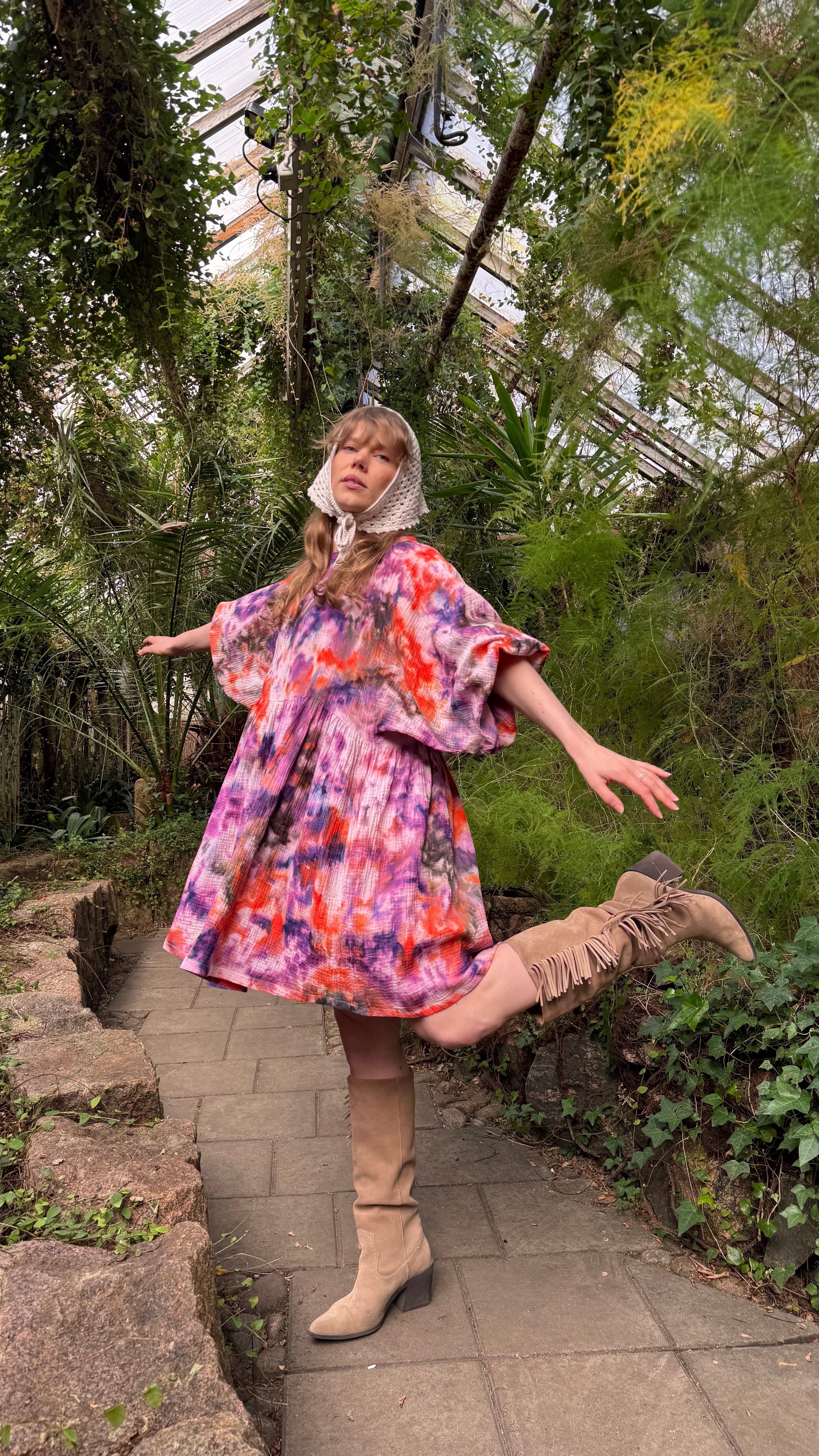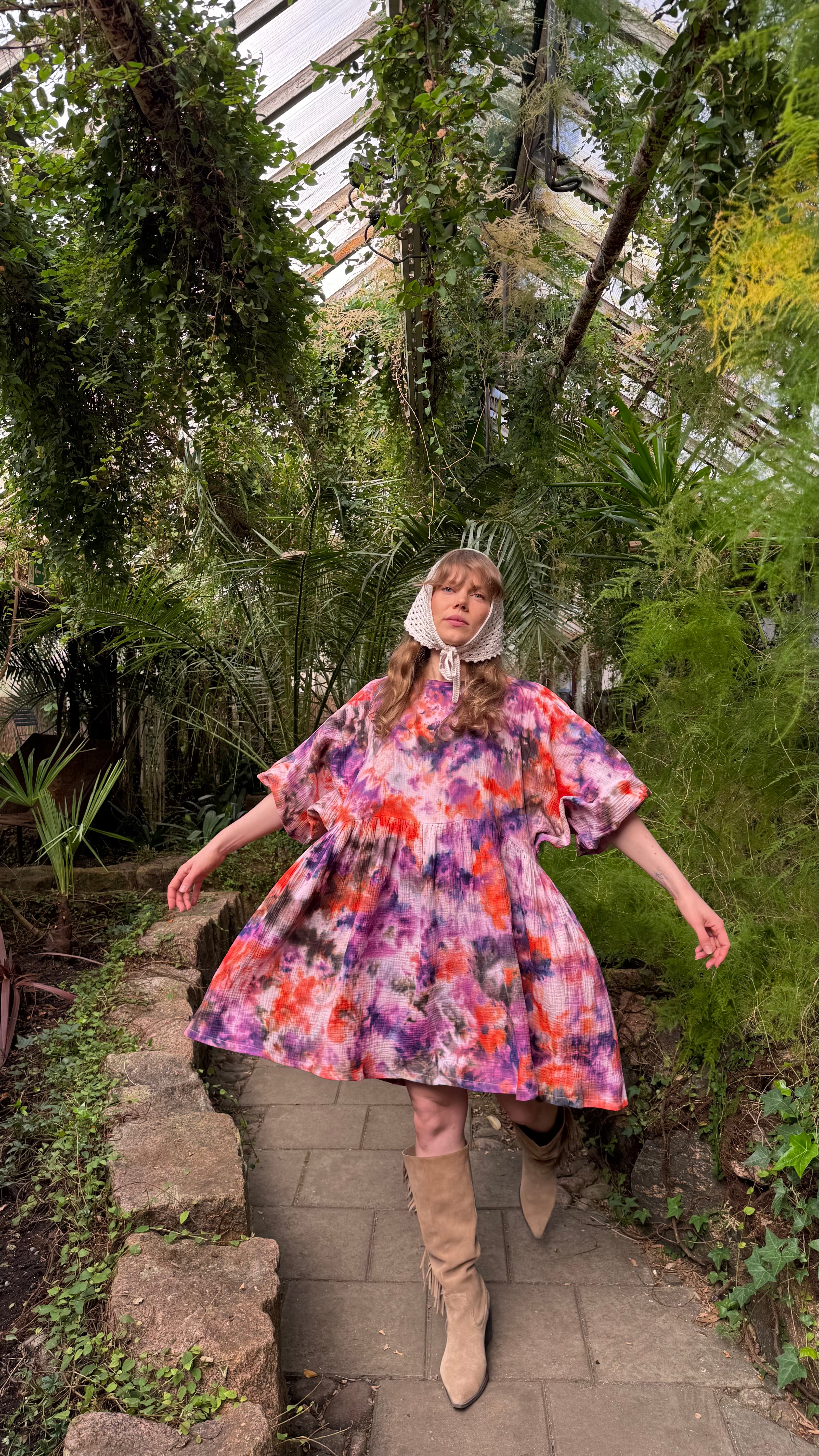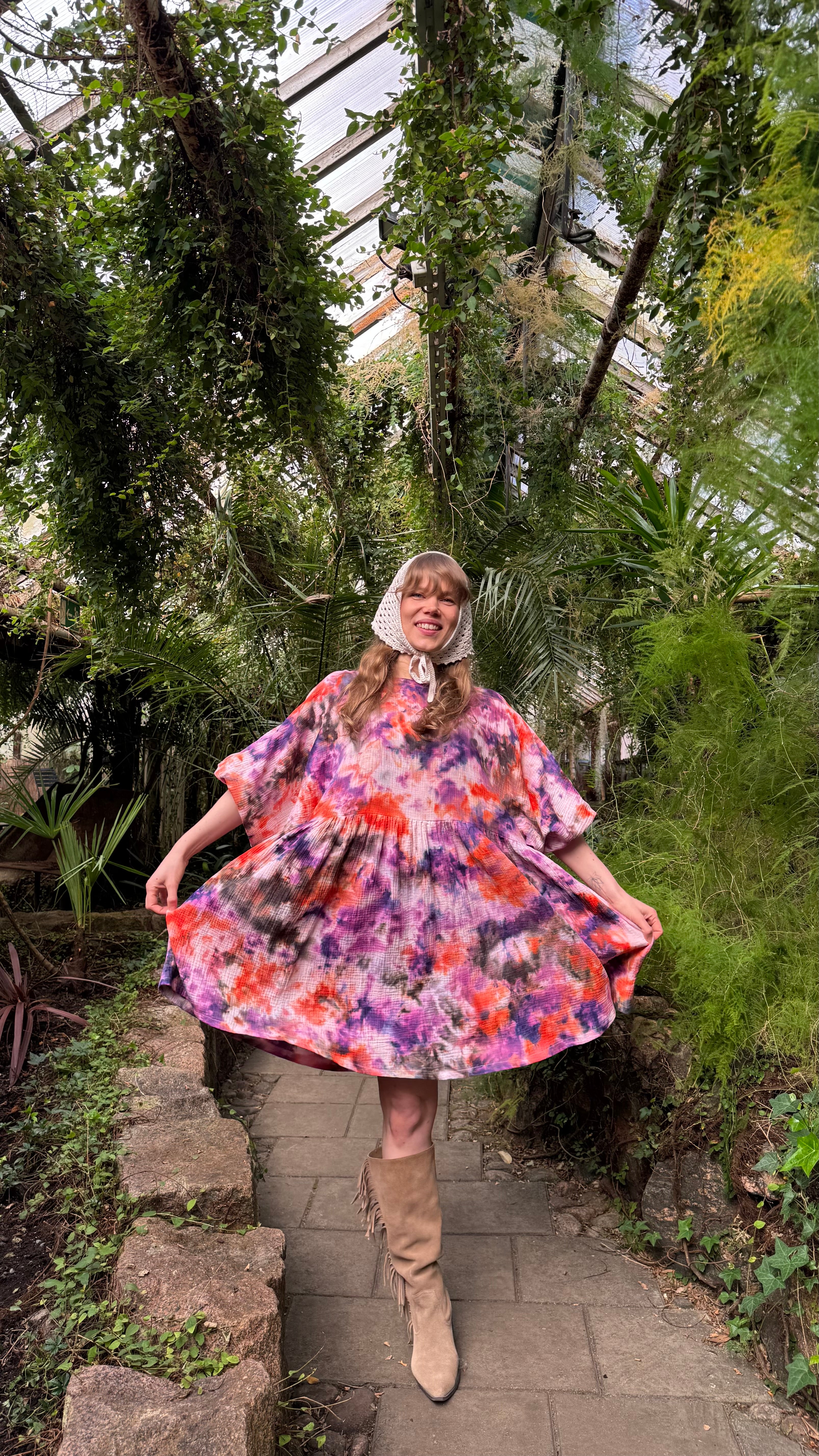 Aurora-mekko on kevyt, ilmava ja ajattoman kaunis valinta arkeen ja juhlaan. Tämä käsinvärjätty musliinimekko hulmuaa kevyesti liikkeessä ja tuntuu ihoa vasten pehmeältä – täydellinen yhdistelmä mukavuutta ja näyttävyyttä.