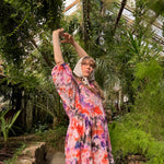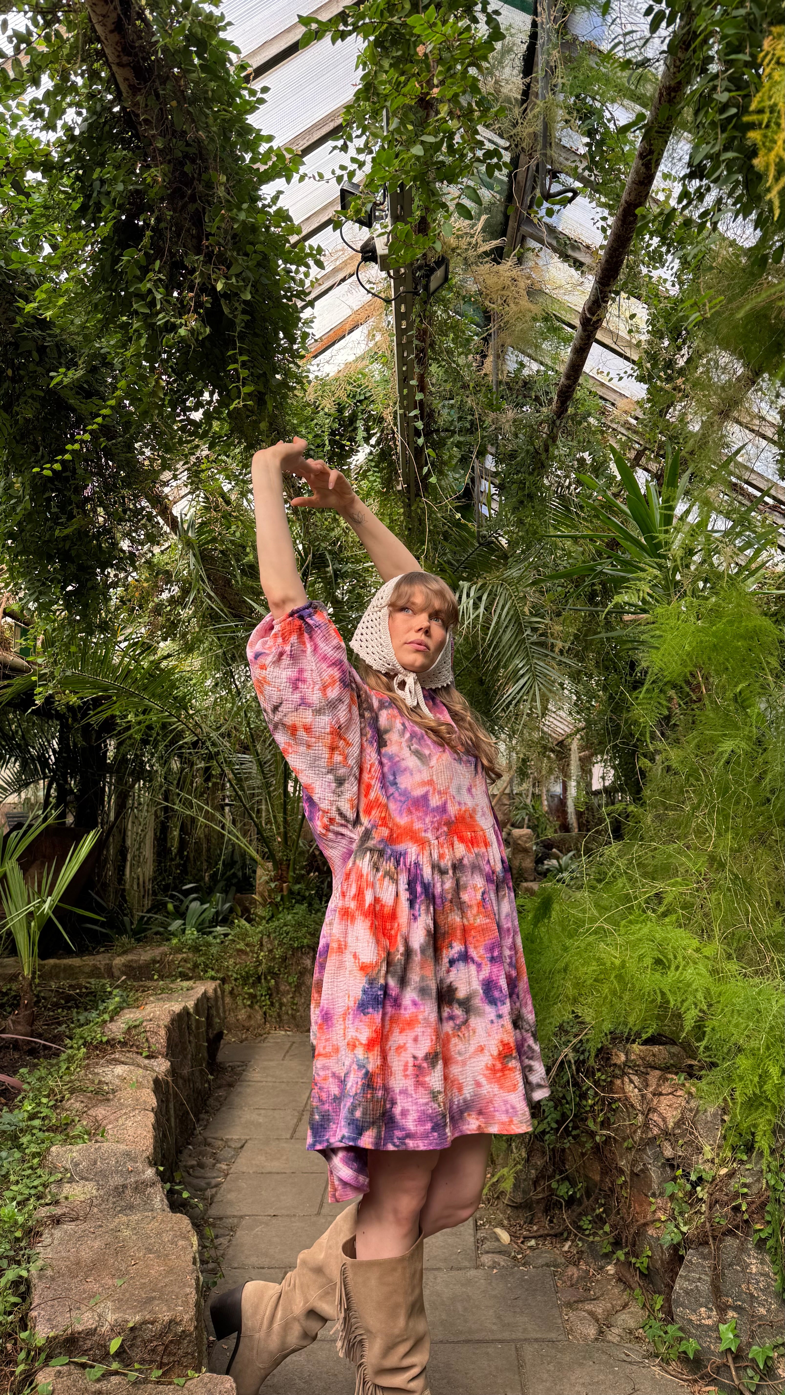 *Huom! Mallilla päällä vastaava sävy. Pieniä kuvio ja sävyeroja saattaa esiintyä myynnissä olevan mekon kanssa. Jokainen mekko käsinvärjätään joka tekee niistä uniikin!