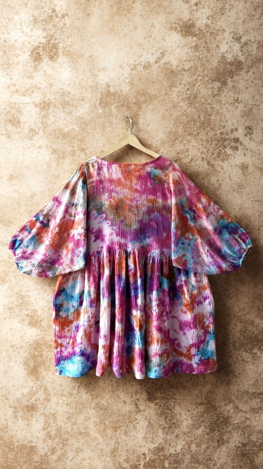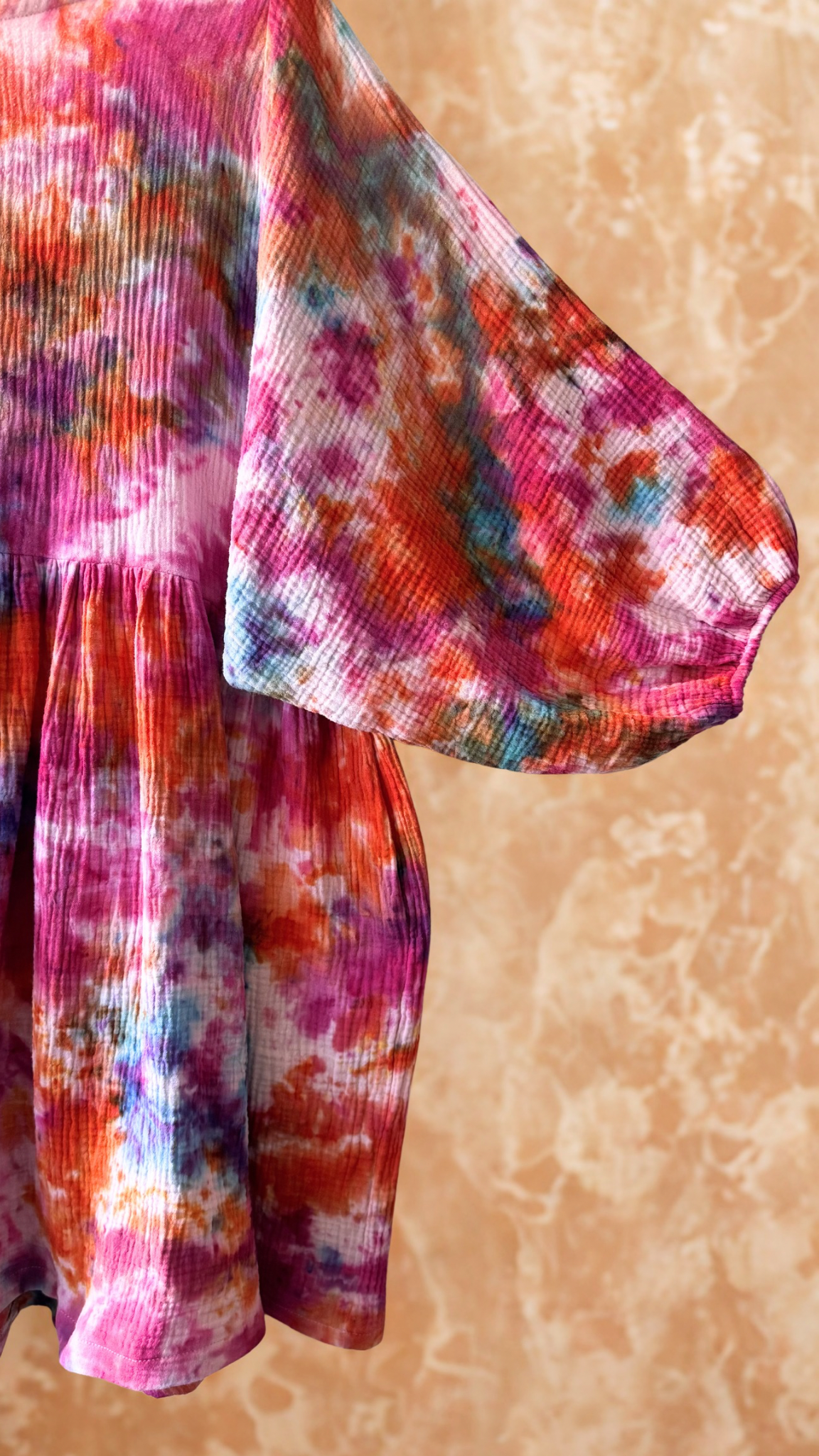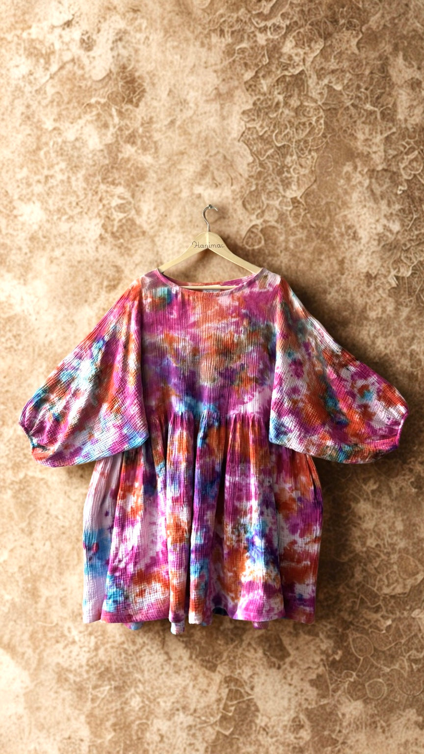 100 % puuvillainen tuplaharsokangas on hengittävä ja eläväpintainen. Käsinvärjäys antaa jokaiselle mekolle uniikin sävyn ja syvyyden, joka tekee siitä yksilöllisen ja katseita herättävän.