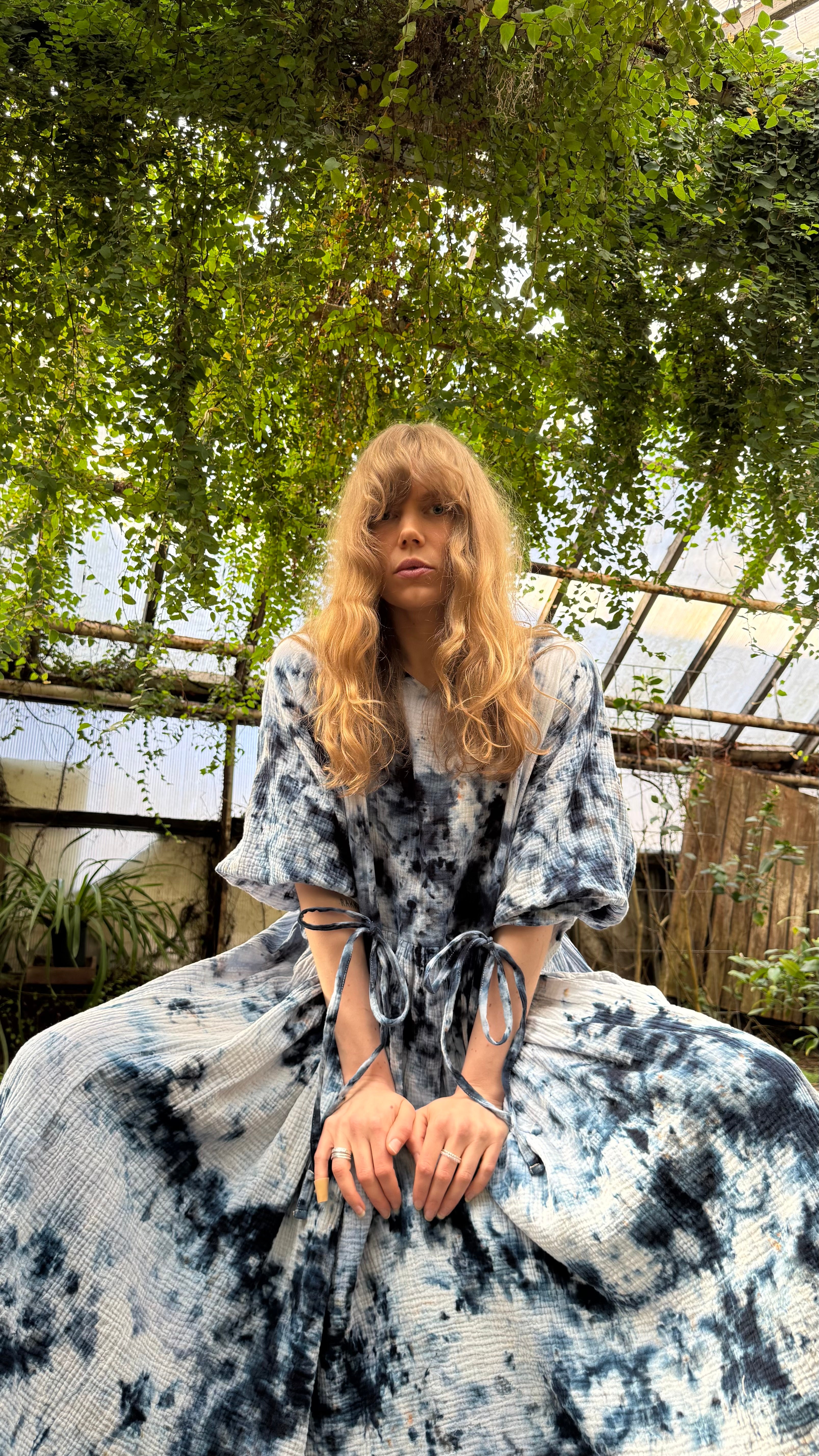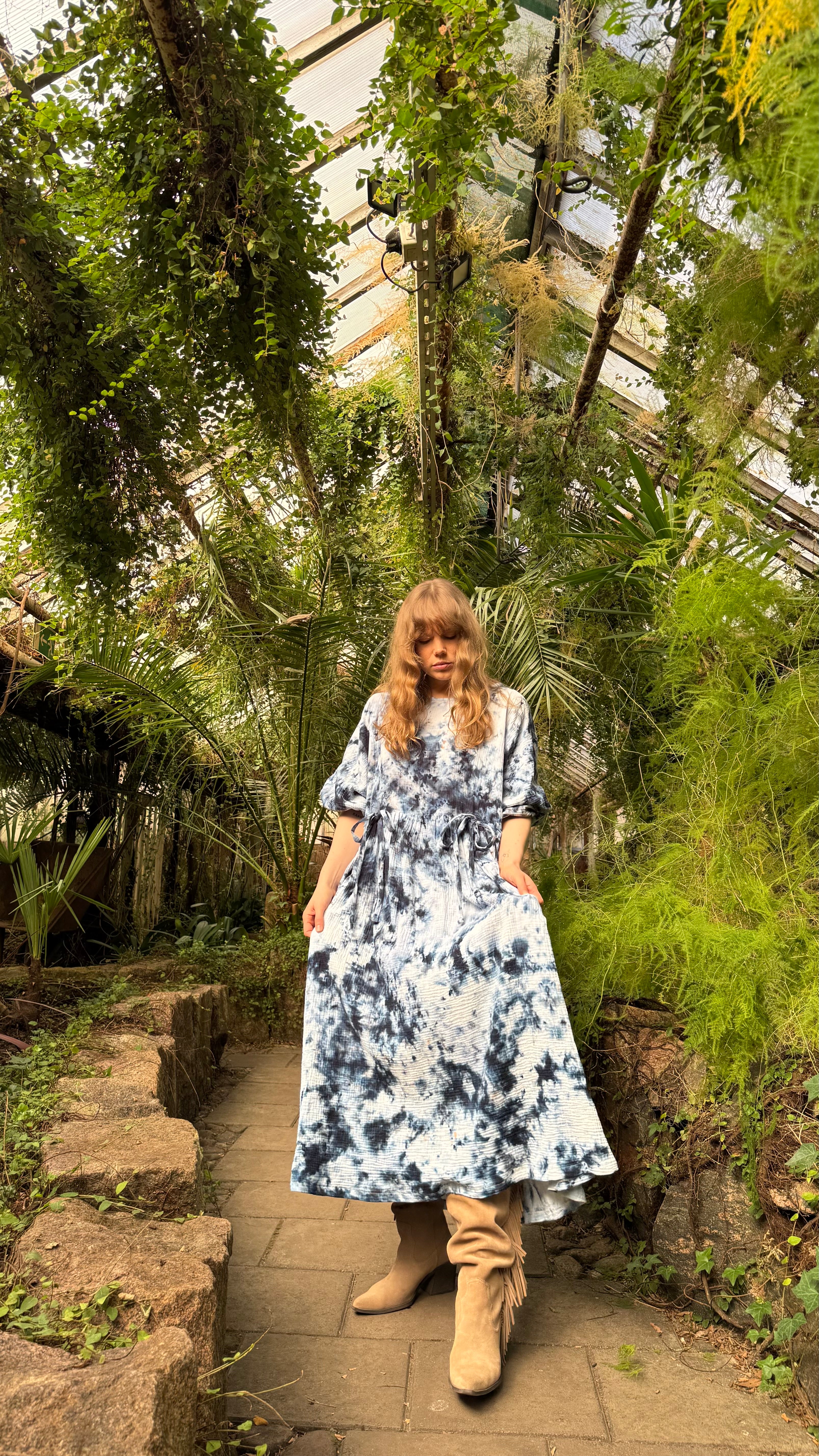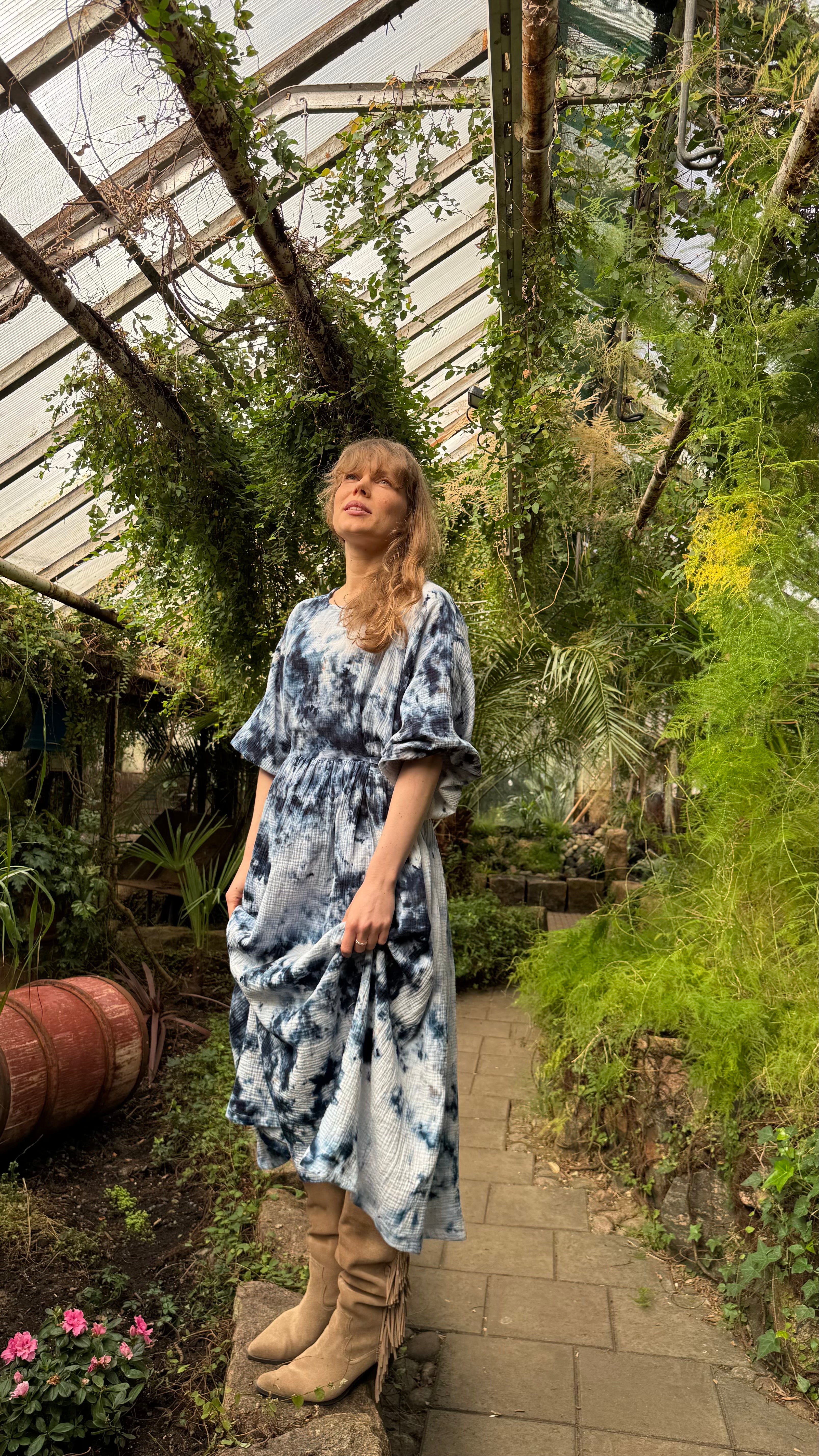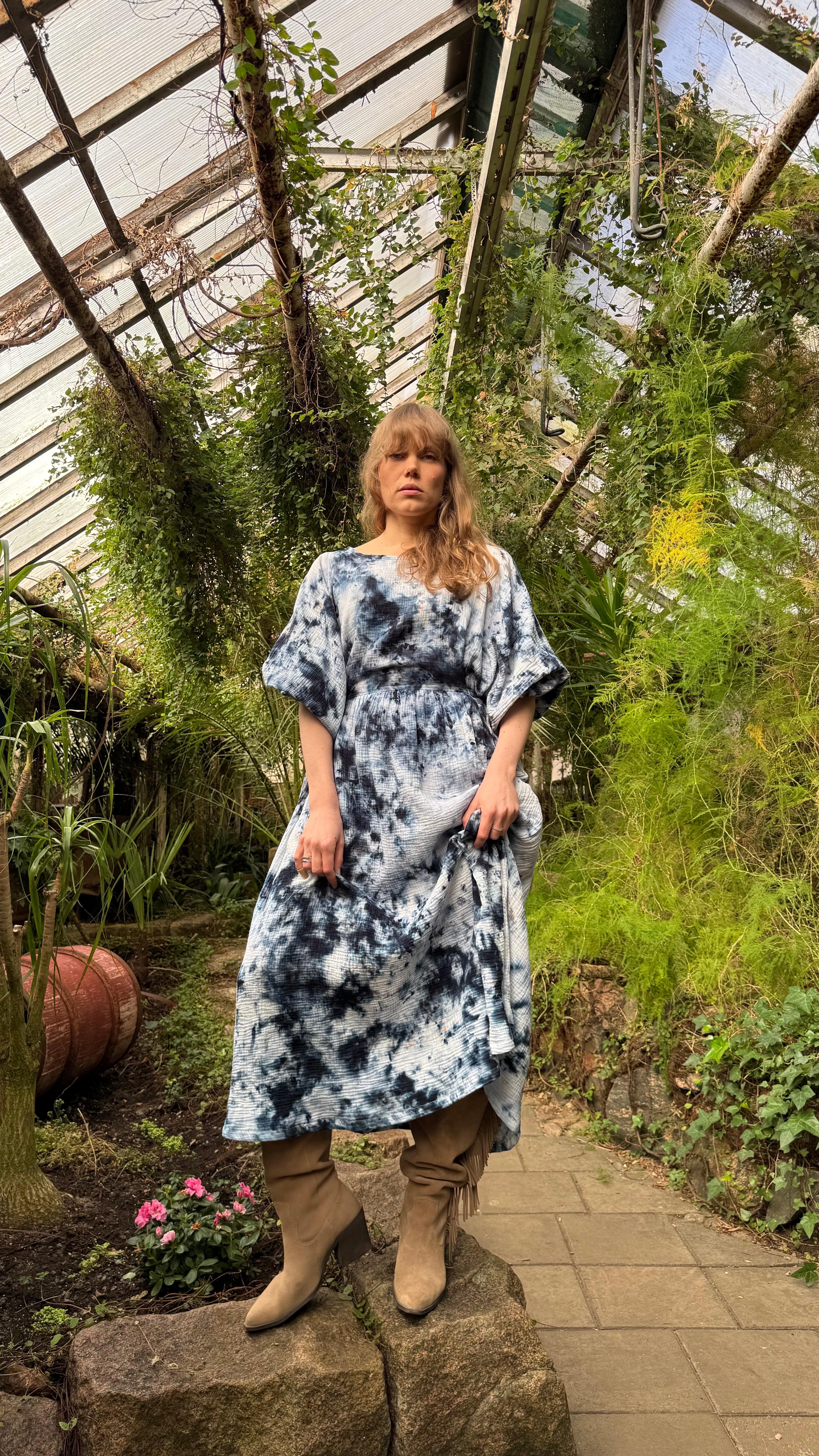 *Huom! Mallilla päällä vastaava sävy. Pieniä kuvio ja sävy eroja saattaa esiintyä myynnissä olevan mekon kanssa. Jokainen mekko käsinvärjätään joka tekee niistä uniikin!