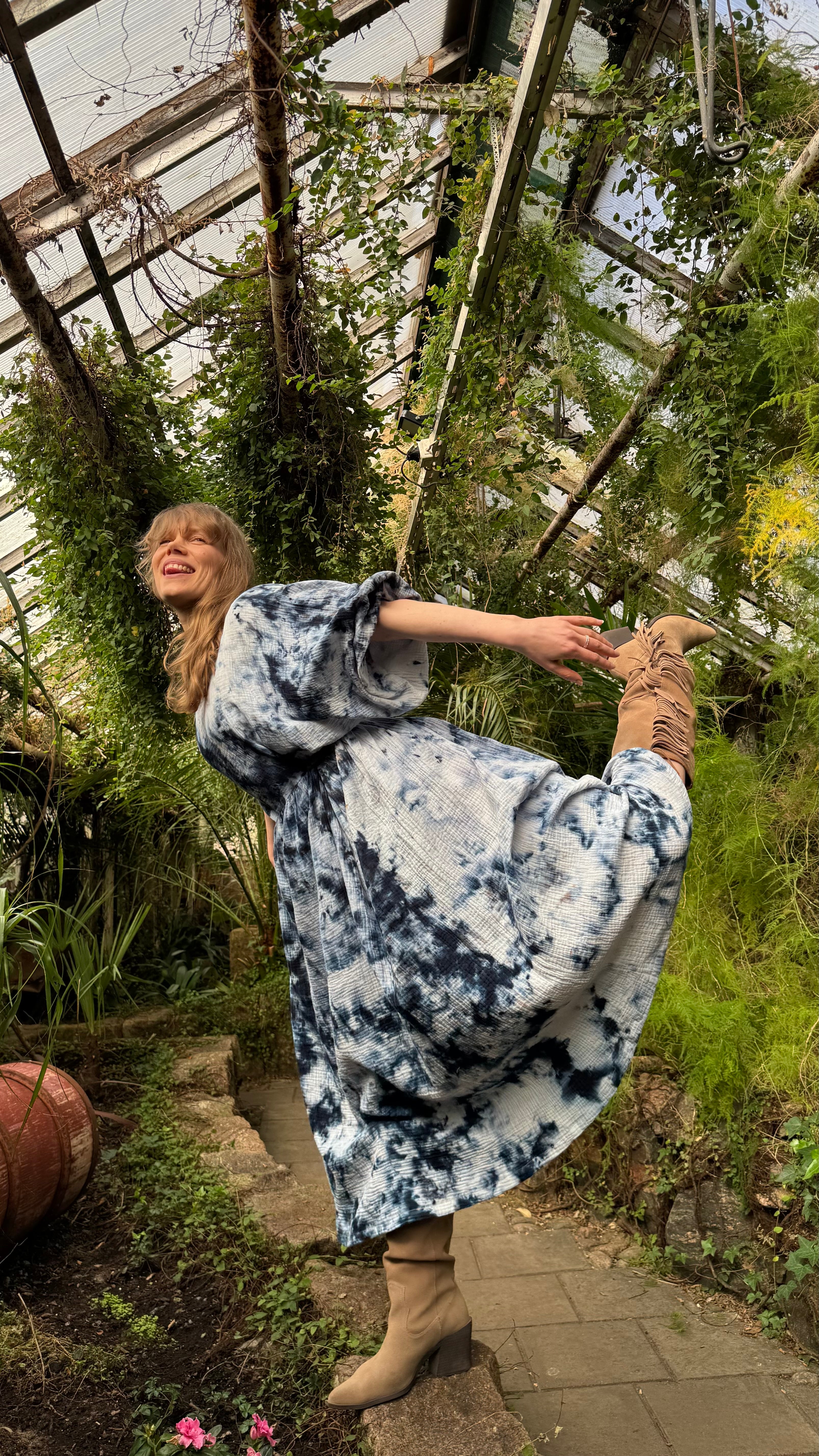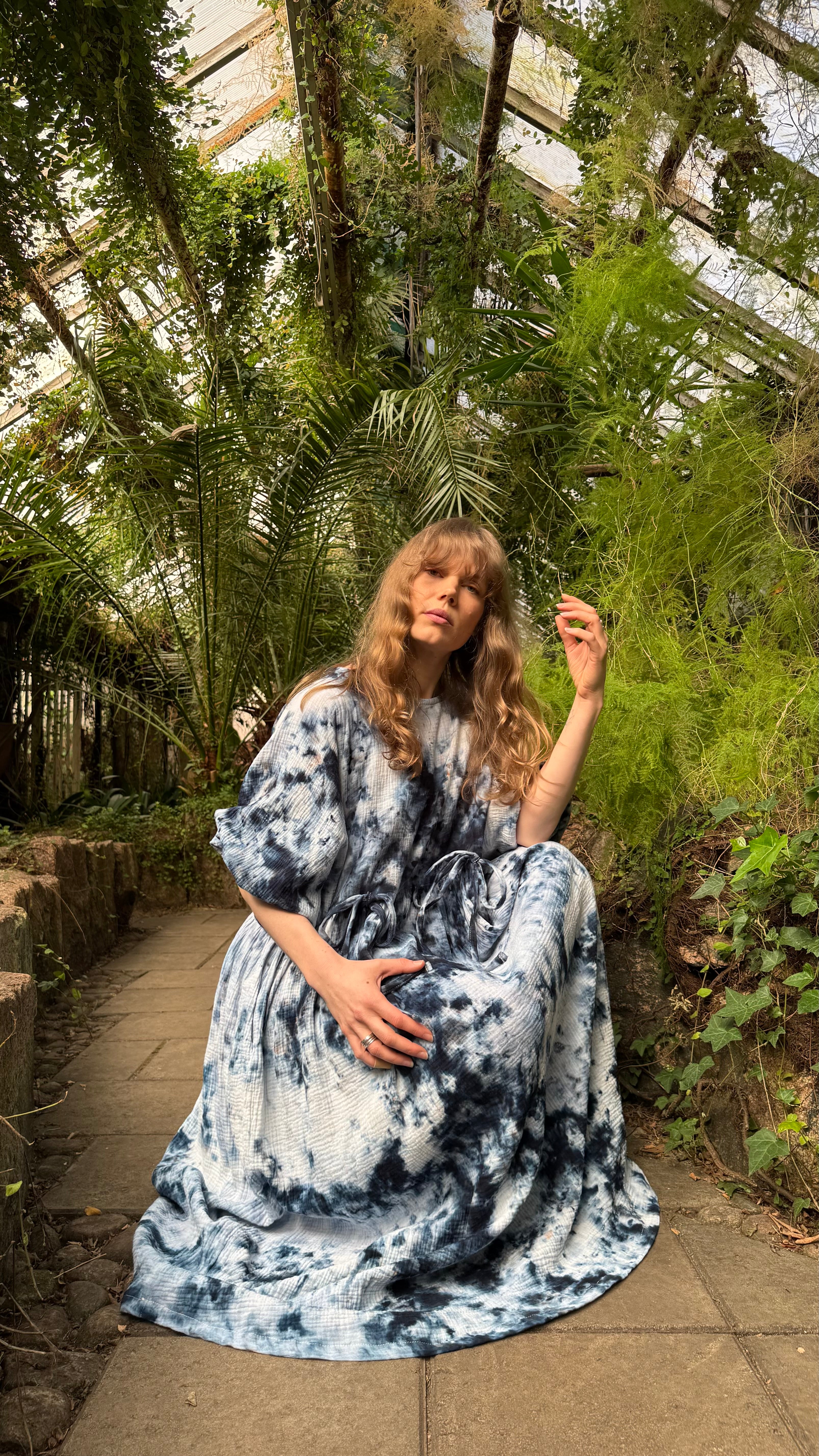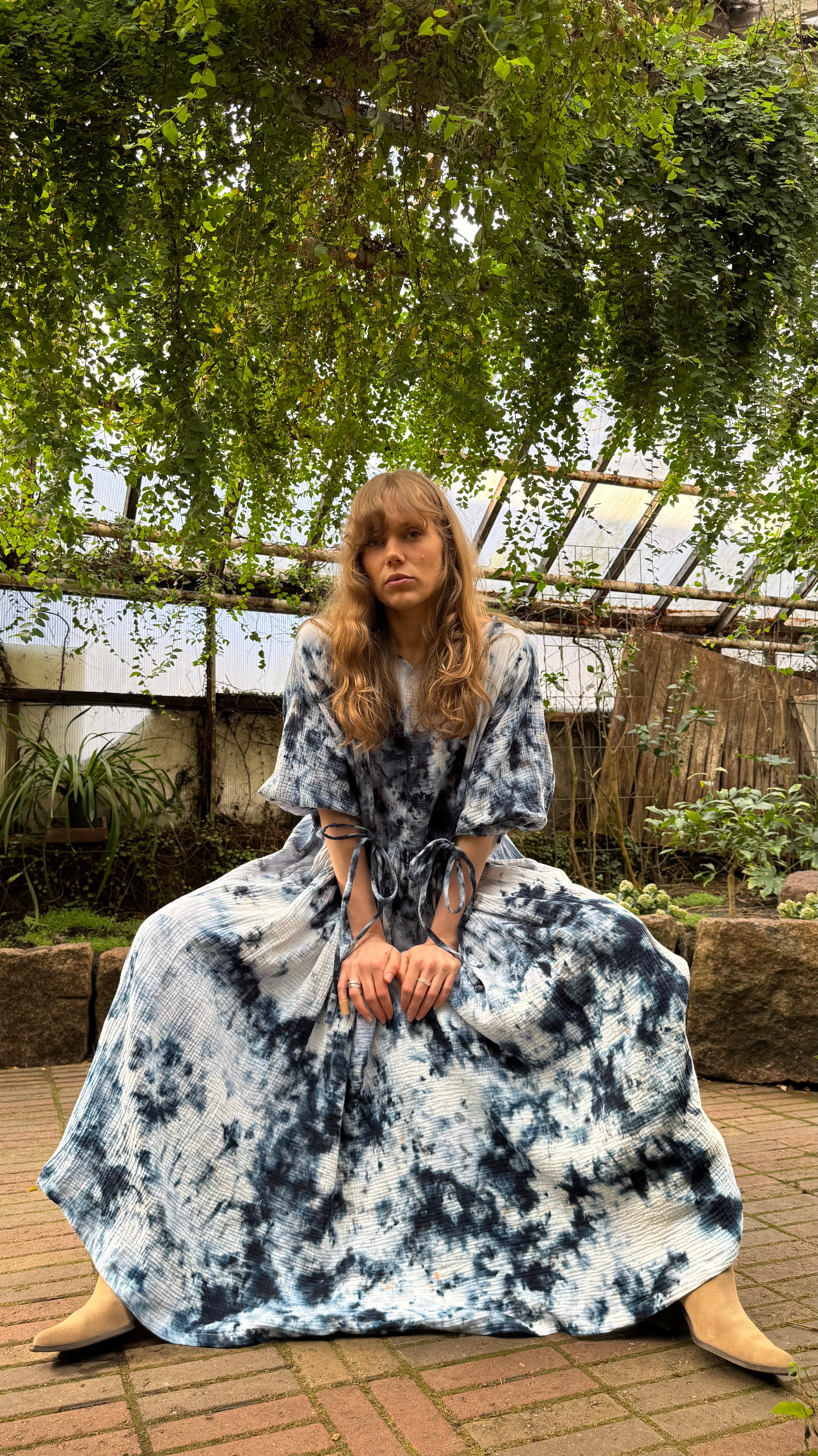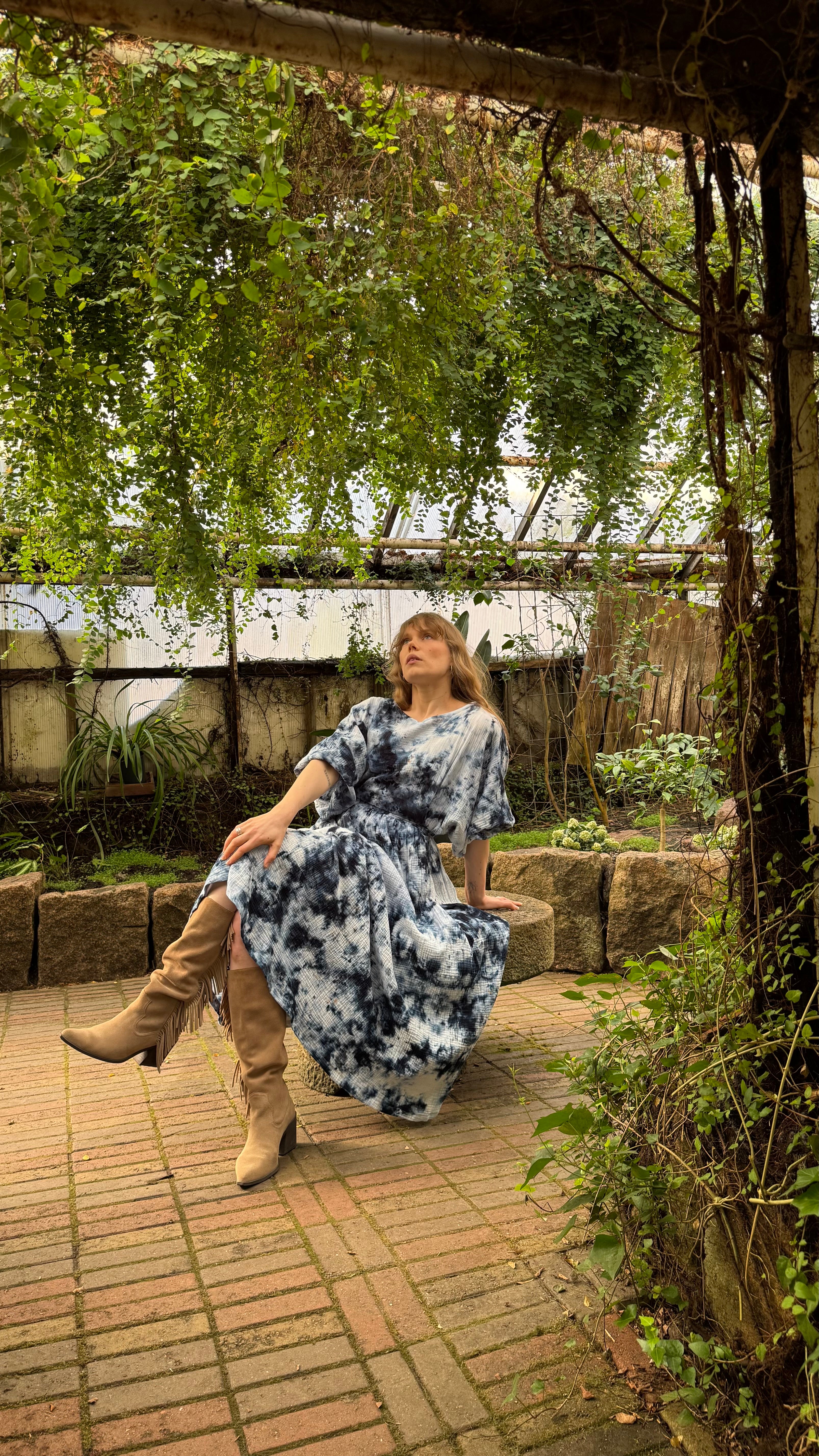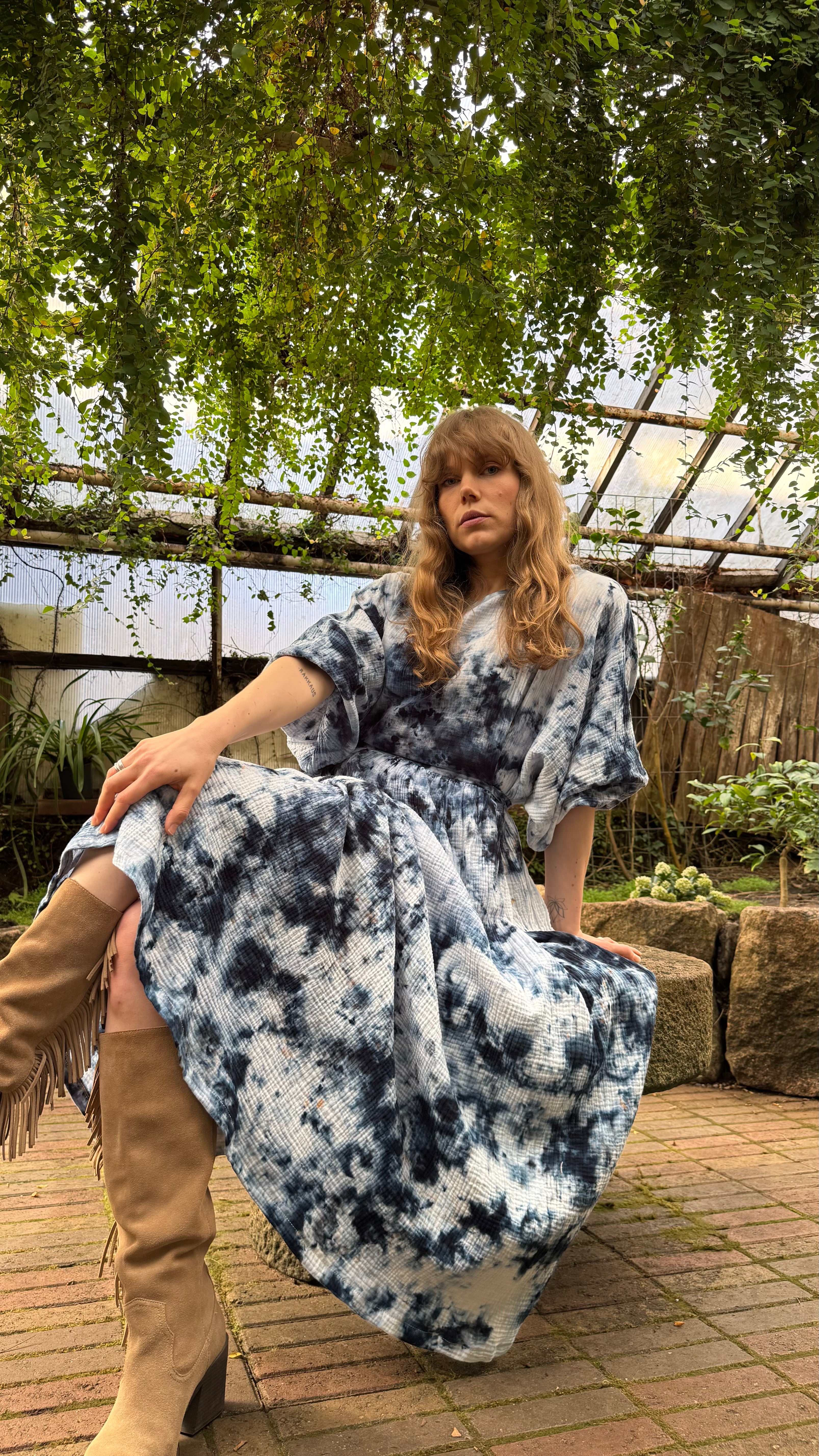 *Huom! Mallilla päällä vastaava sävy. Pieniä kuvio ja sävy eroja saattaa esiintyä myynnissä olevan mekon kanssa. Jokainen mekko käsinvärjätään joka tekee niistä uniikin!