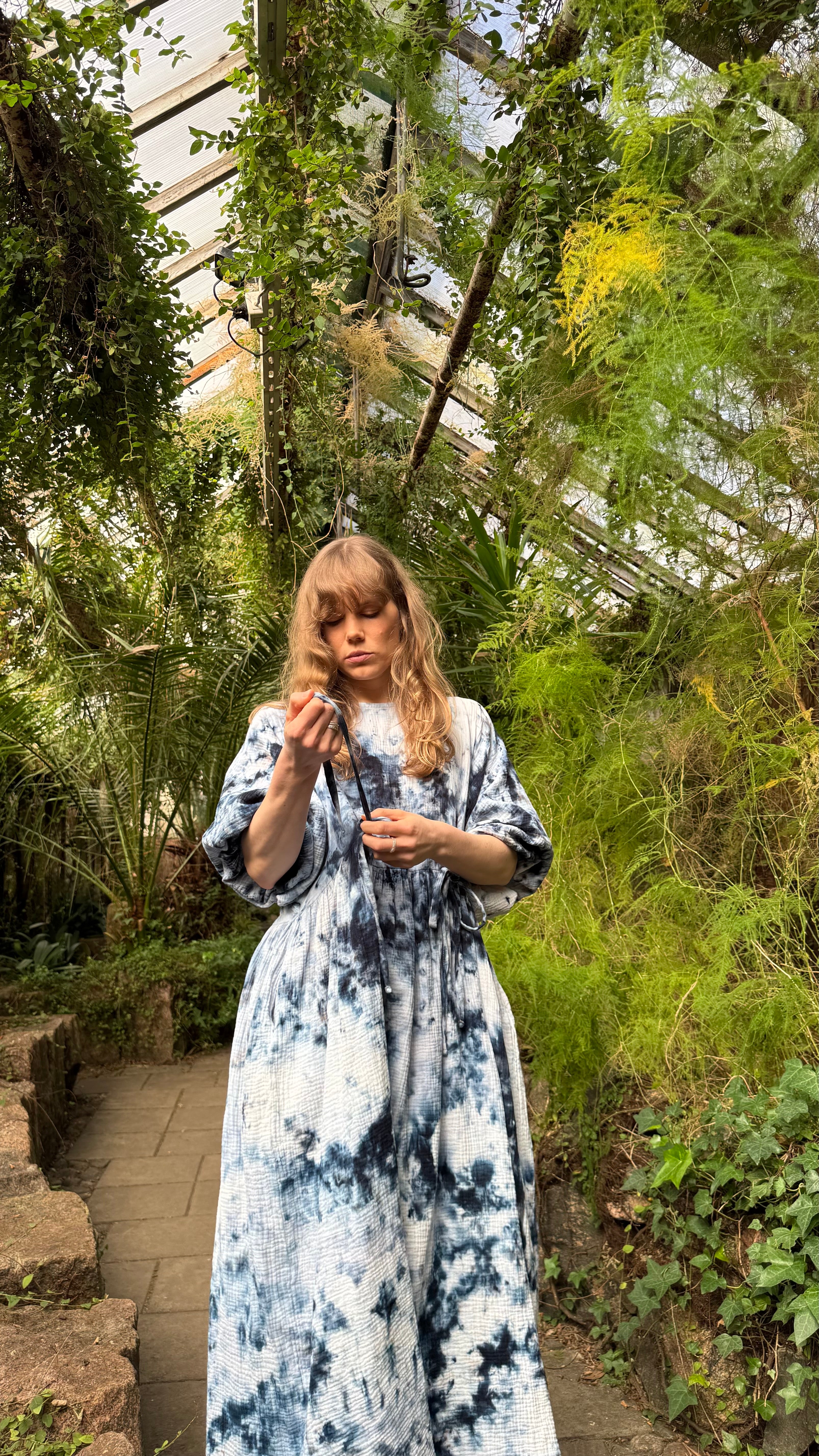 Aurora on käsinvärjätty mekko, joka valmistetaan Helsingissä. 100 % puuvillainen musliinikangas (tuplaharso) on hengittävä, ilmava ja pehmeä ihoa vasten. Jokainen mekko on uniikki, sillä käsinvärjäys luo kauniin elävän sävyn ja tekstuurin.