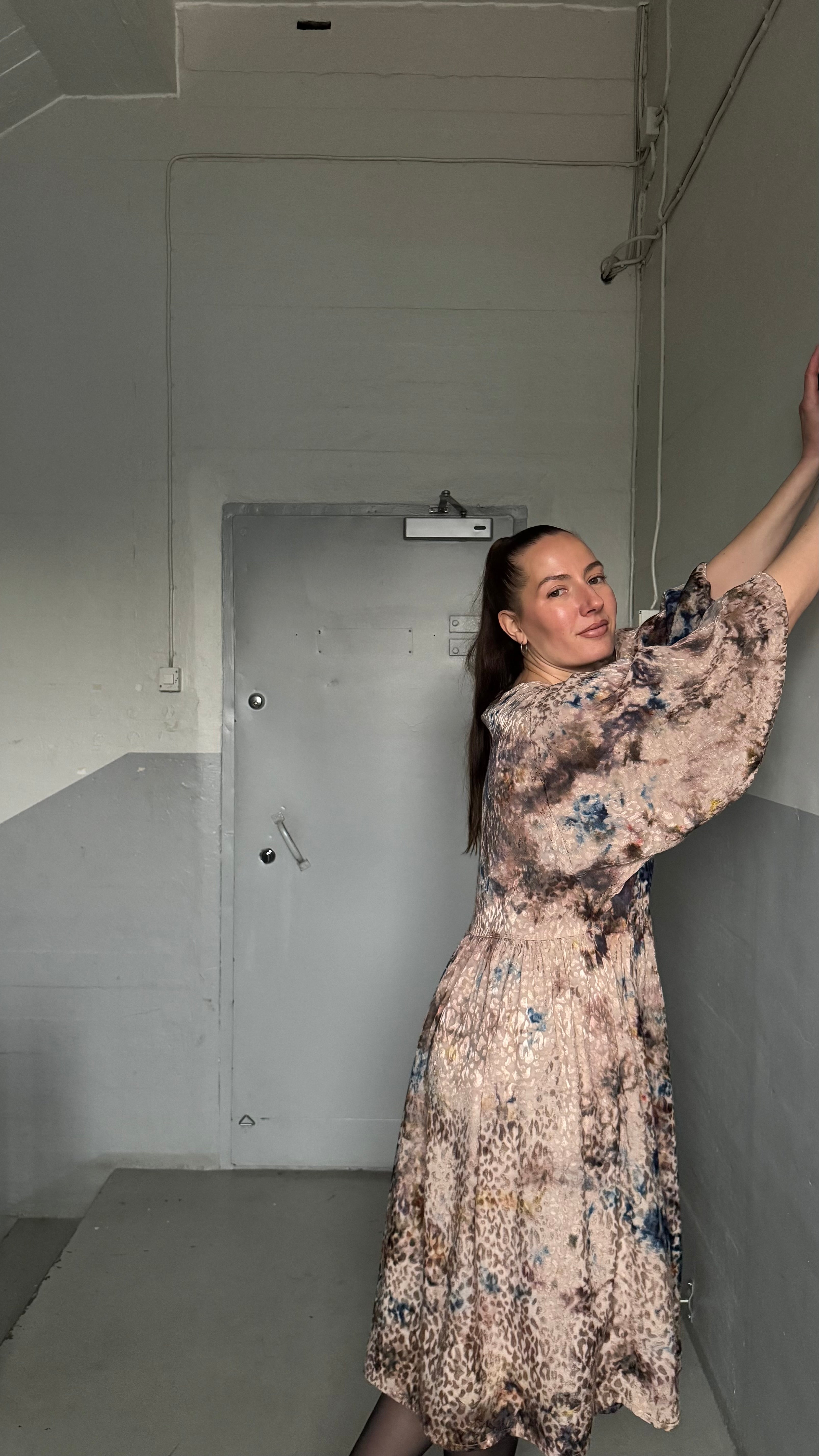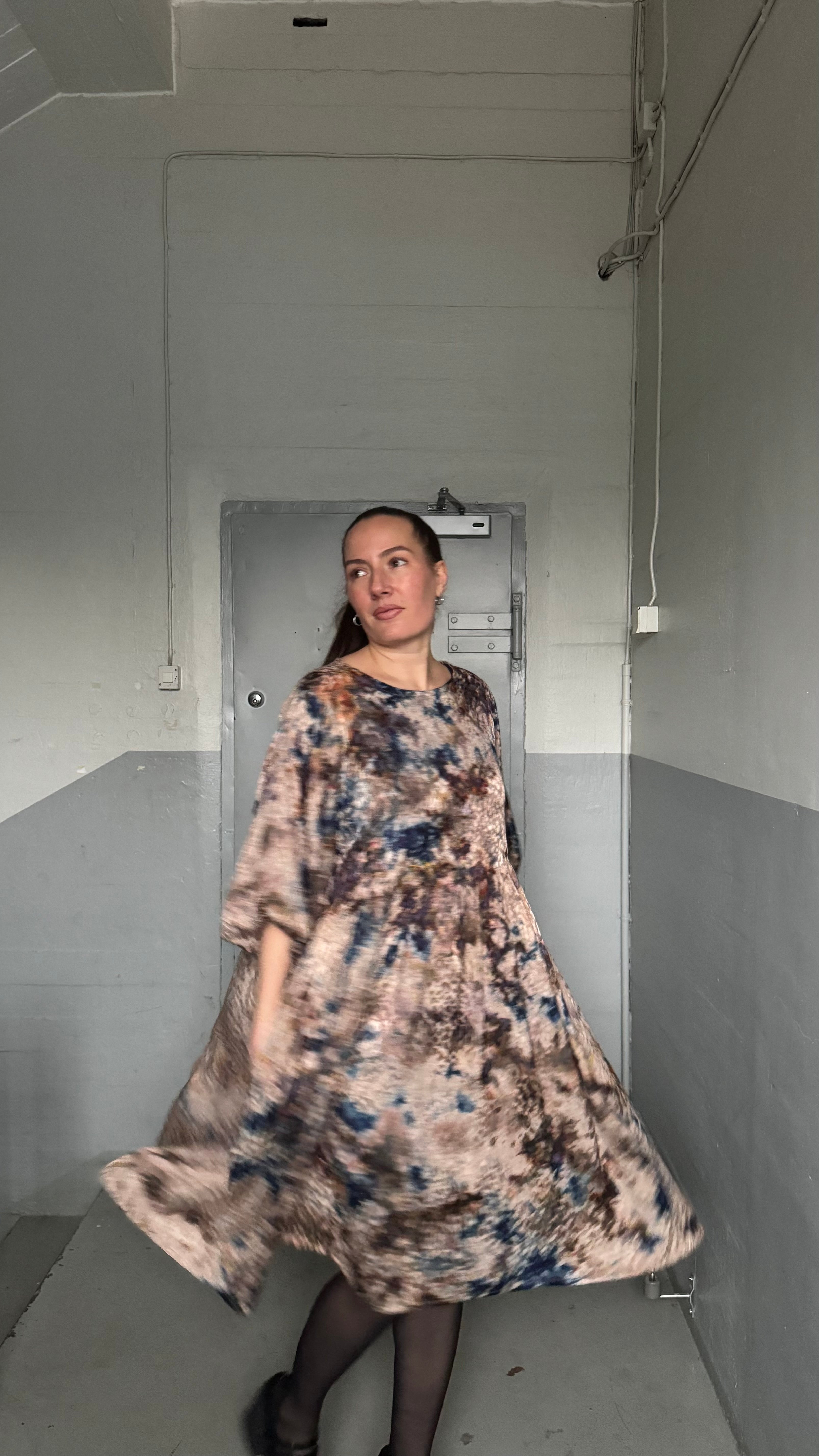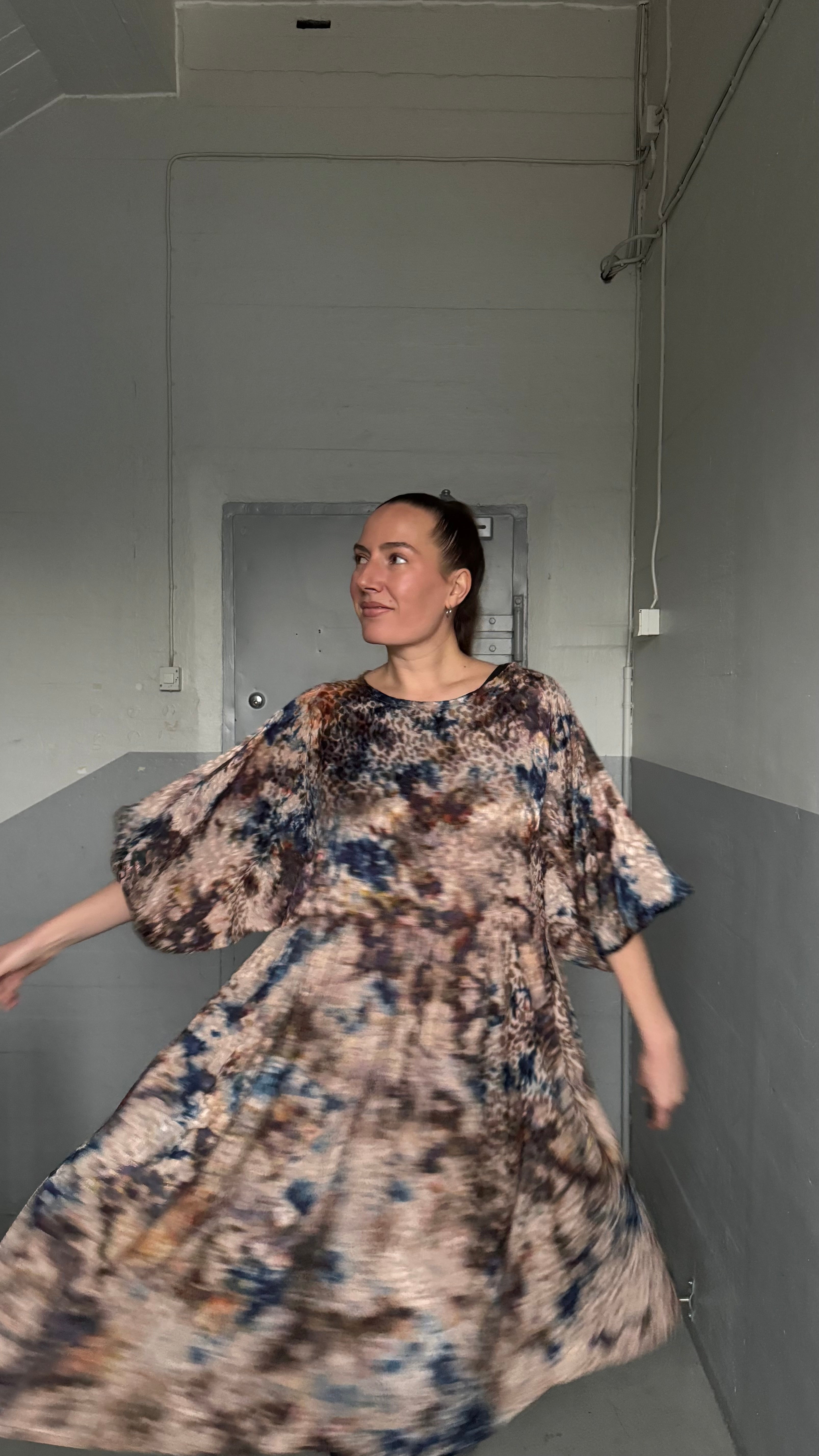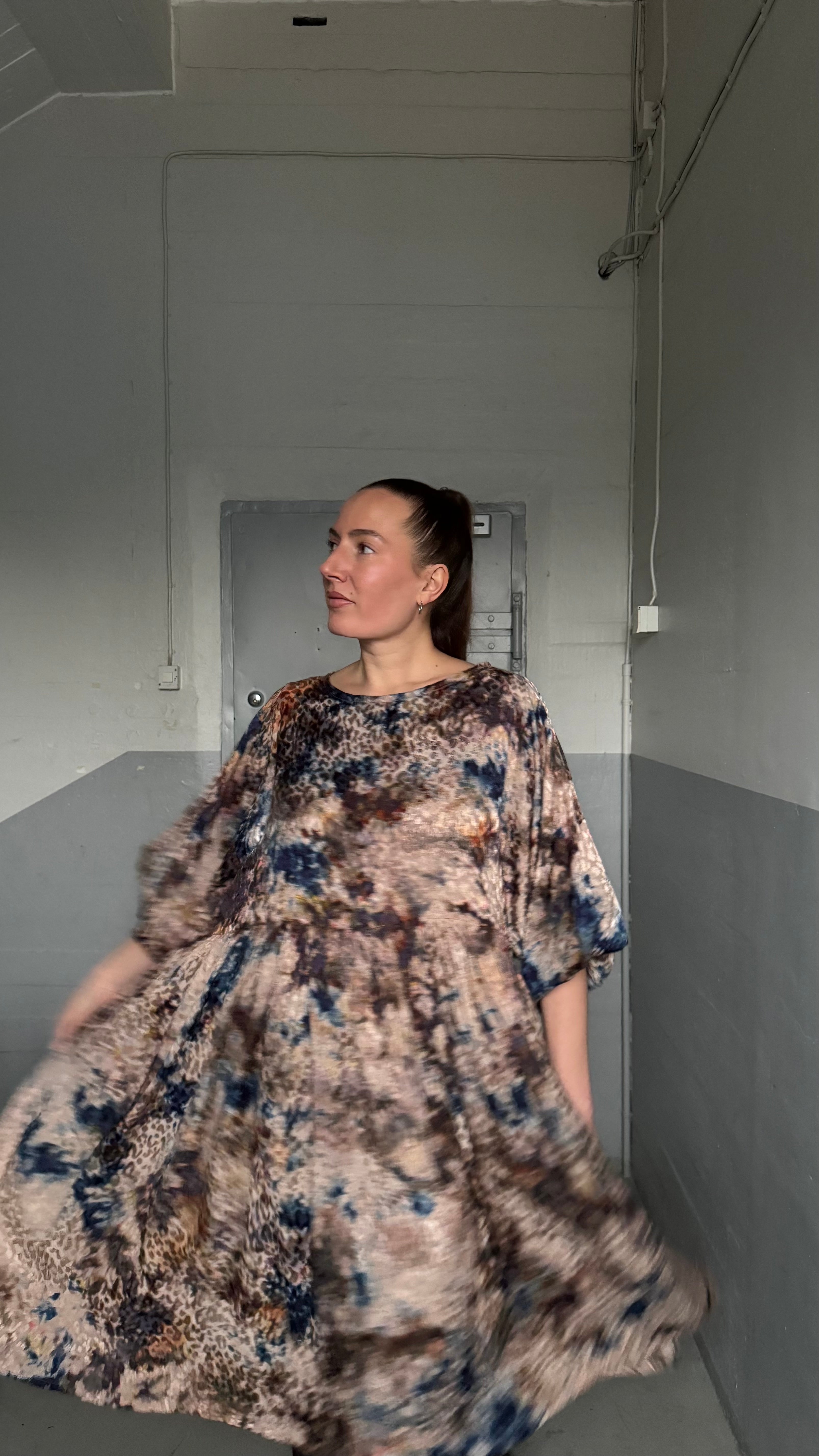 Tämä pantterikankainen Aurora on mitaltaan lyhyttä Aurora-mekkoa hieman pidempi, jolloin helma laskeutuu polven alapuolelle ja luo kokonaisuuteen juhlavamman, elegantin pituuden. Malli säilyttää Auroralle tutun rennon istuvuuden ja liikkeen vapauden, mutta tuo asuun hienostuneen juhlavivahteen.