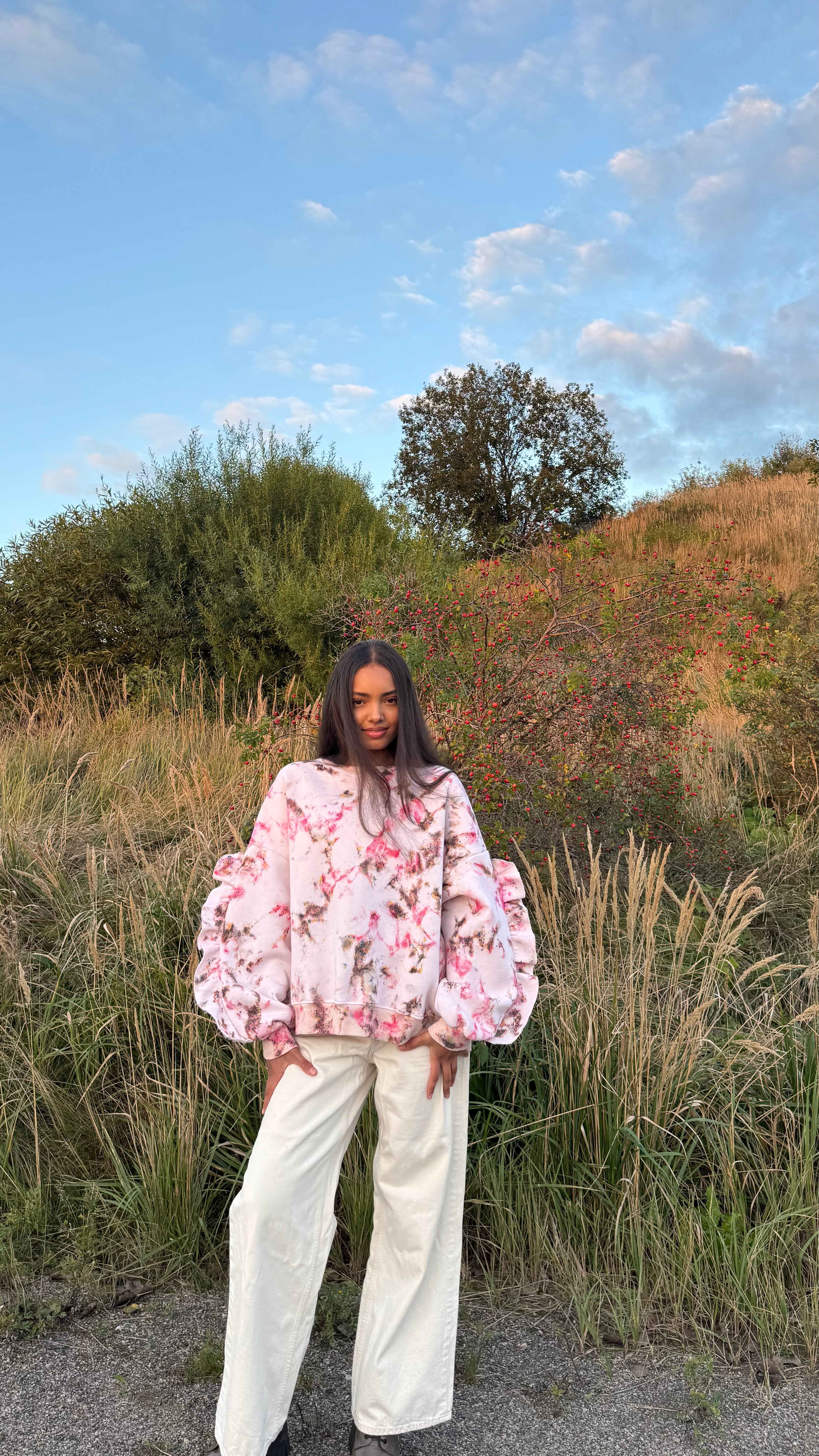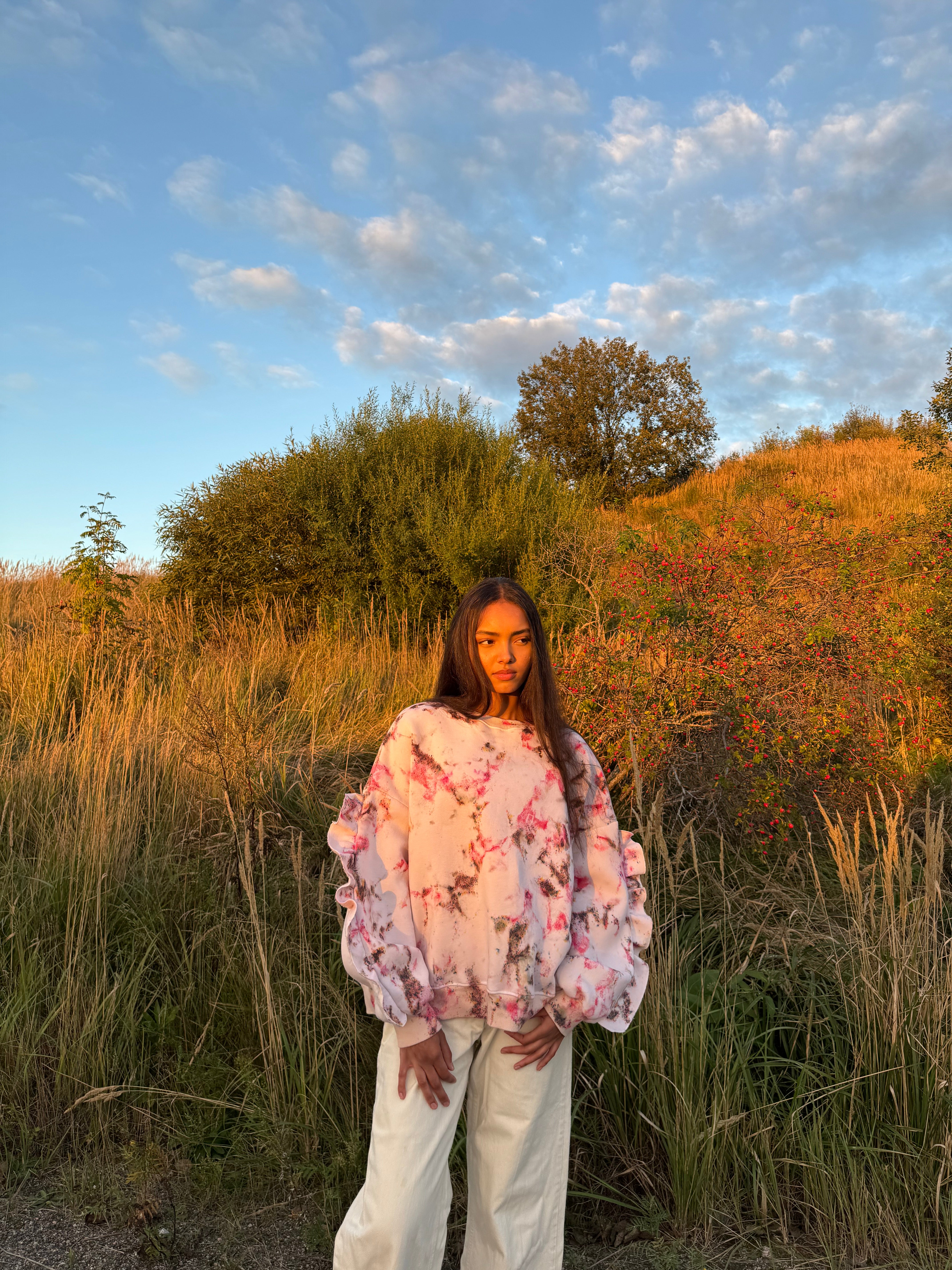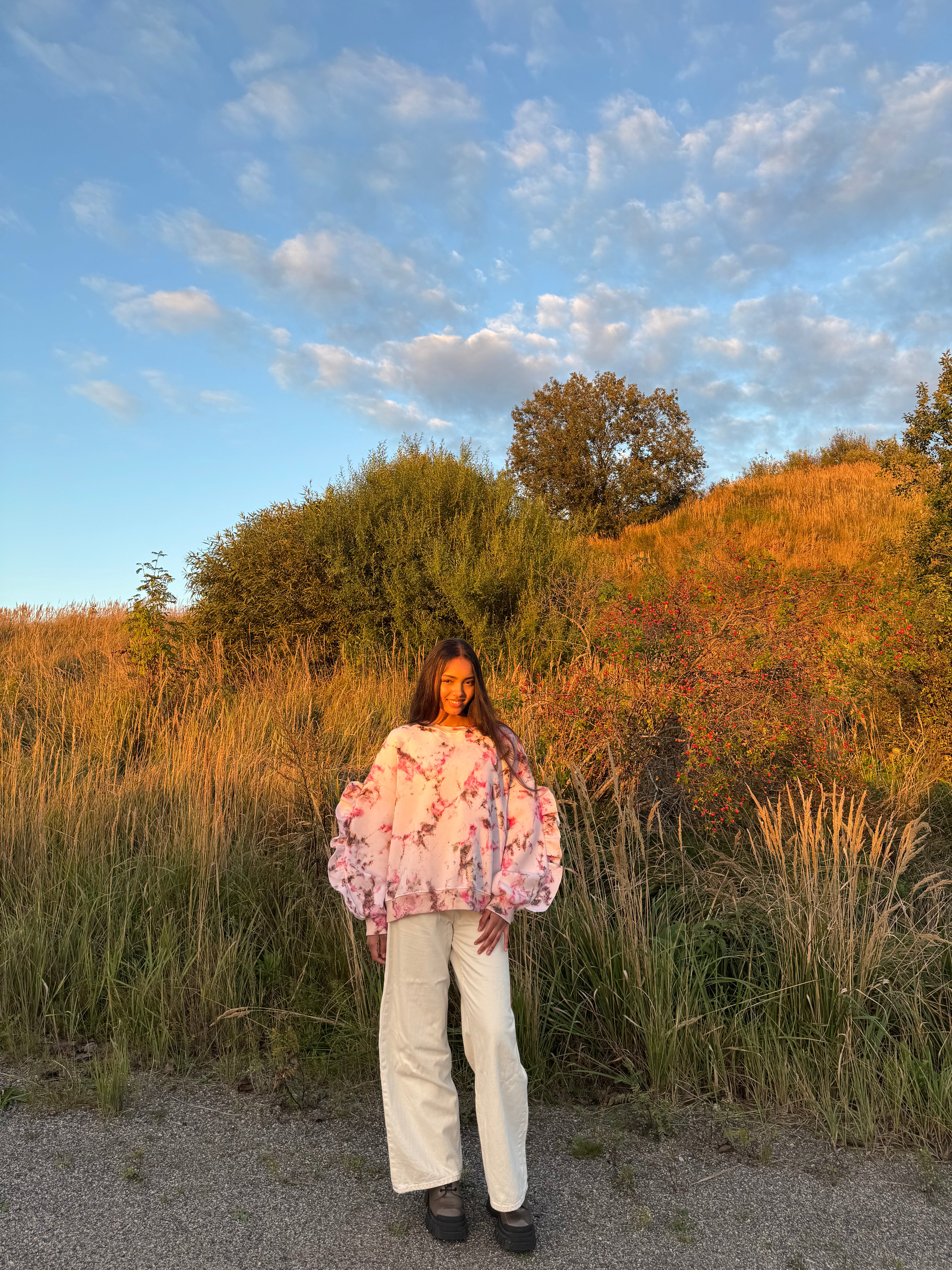 Tämä oversize-mallinen unelmapaita tuo mukavuutta ja tyyliä arkeen! Suloiset frillayksityiskohdat hihoissa tekevät asusta näyttävän ja naisellisen, ja madallettu olkasauma tuo rennon ilmeen. Superpehmeä, jämäkkä ja laadukas collegekangas tuntuu ihanalta päällä ja säilyttää muotonsa pesusta toiseen.