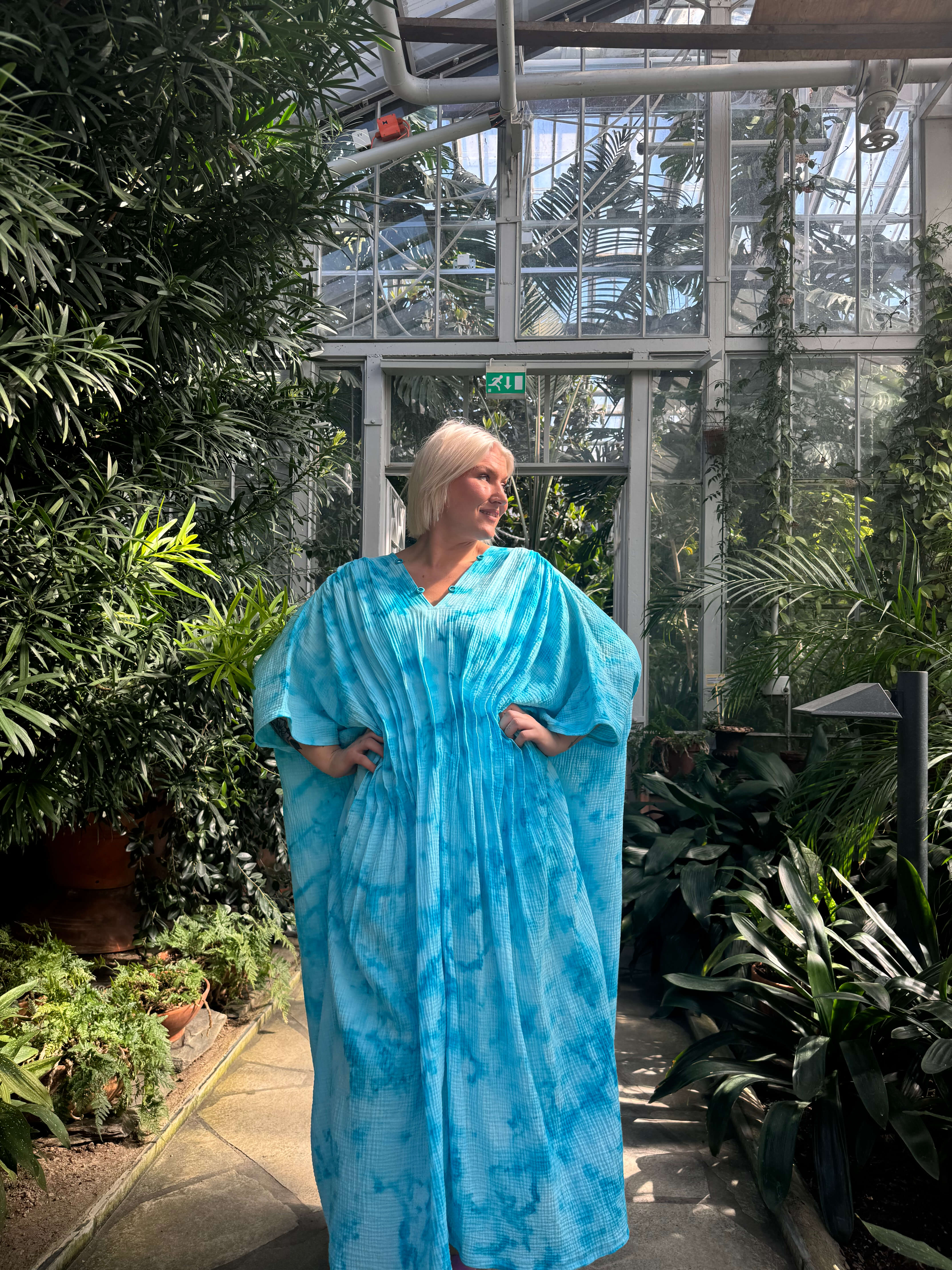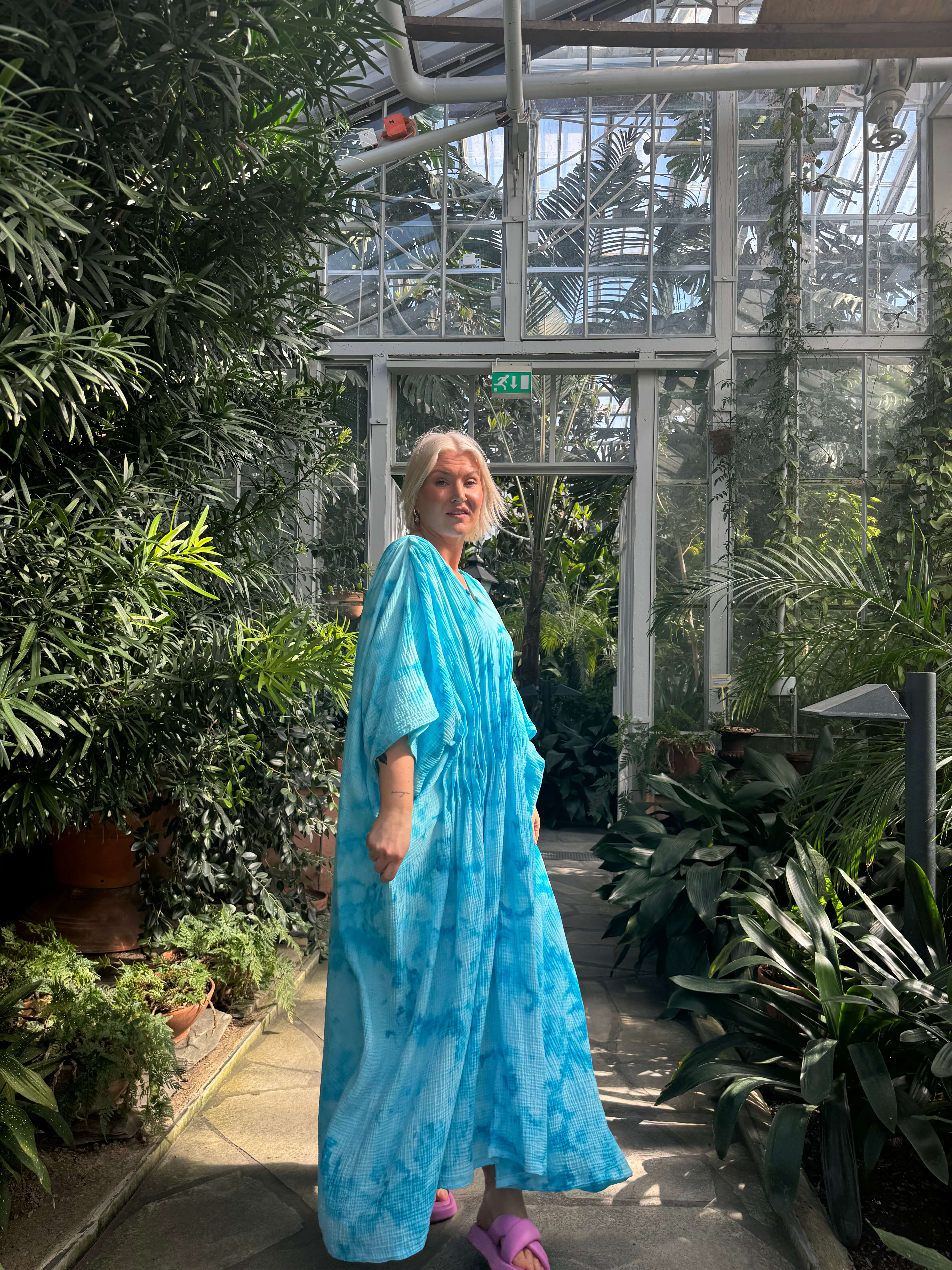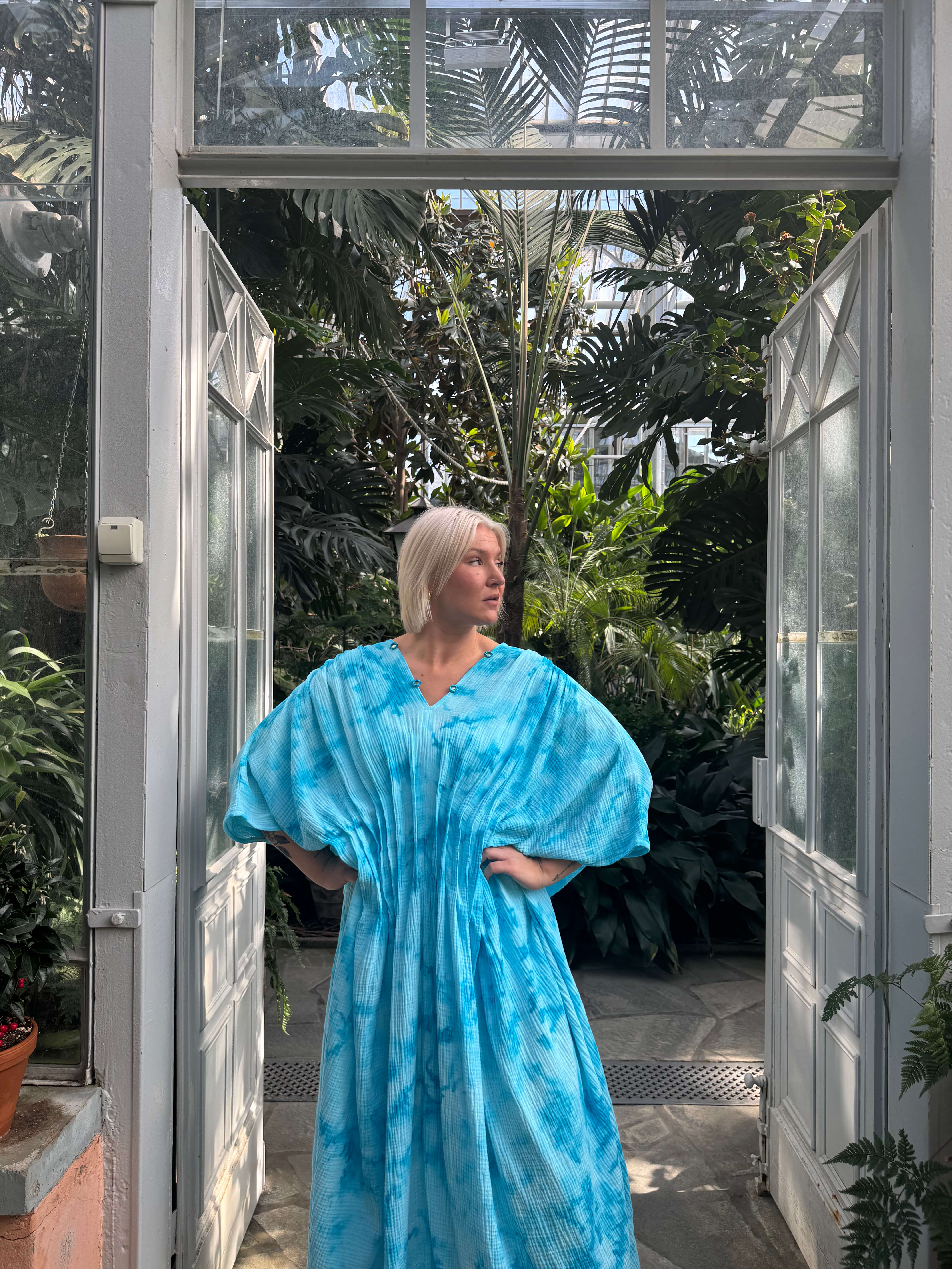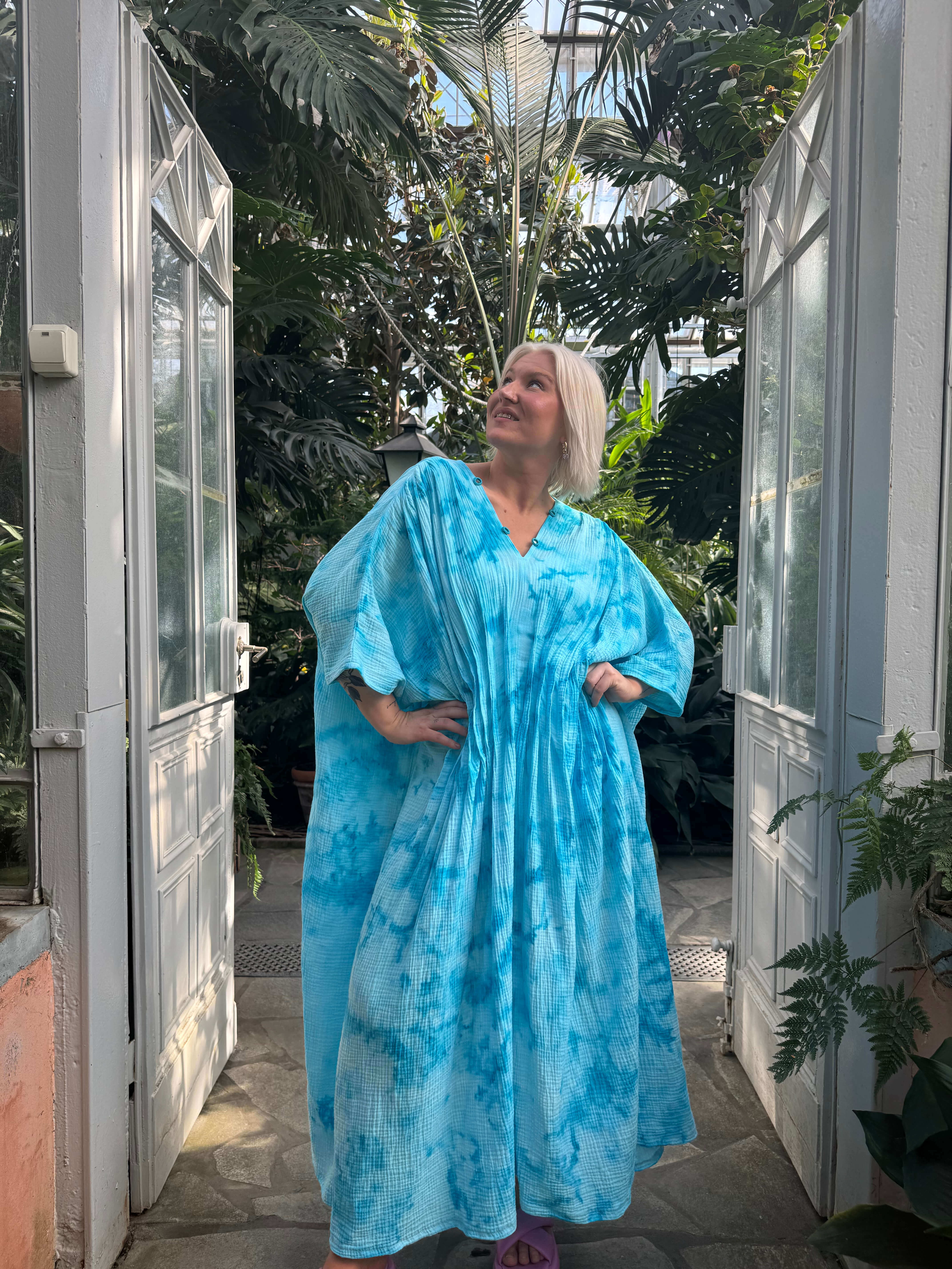 Tämä väljä ja ilmava kaftaani on suunniteltu kulkemaan kanssasi arjen ja juhlan välillä. Edessä vyötäröllä olevat laskokset tuovat kauniin muodon ja ryhdin muuten rentoon siluettiin. Pehmeä musliinikangas laskeutuu kauniisti, ja jokainen kappale on käsinvärjätty – täysin uniikki.