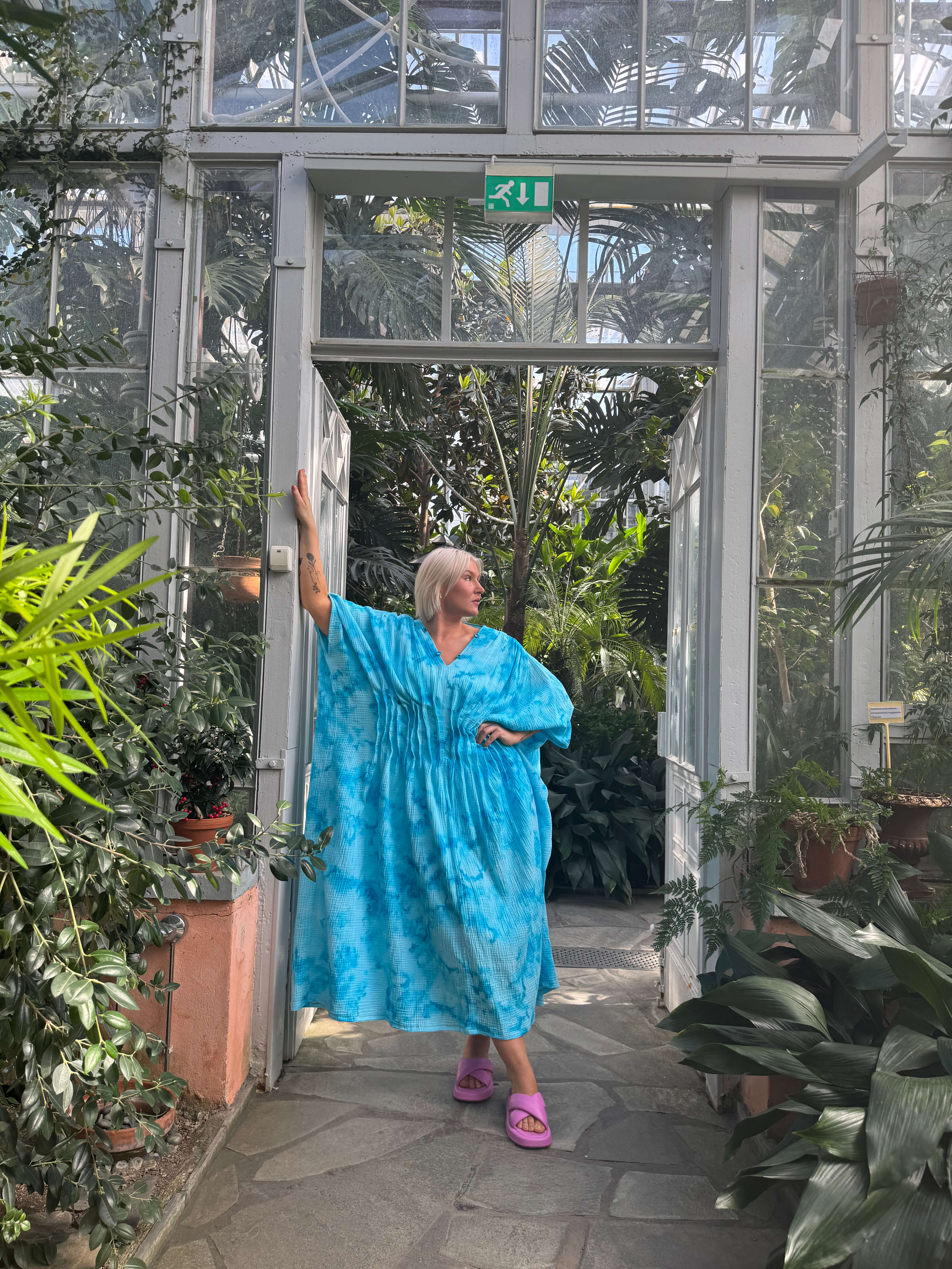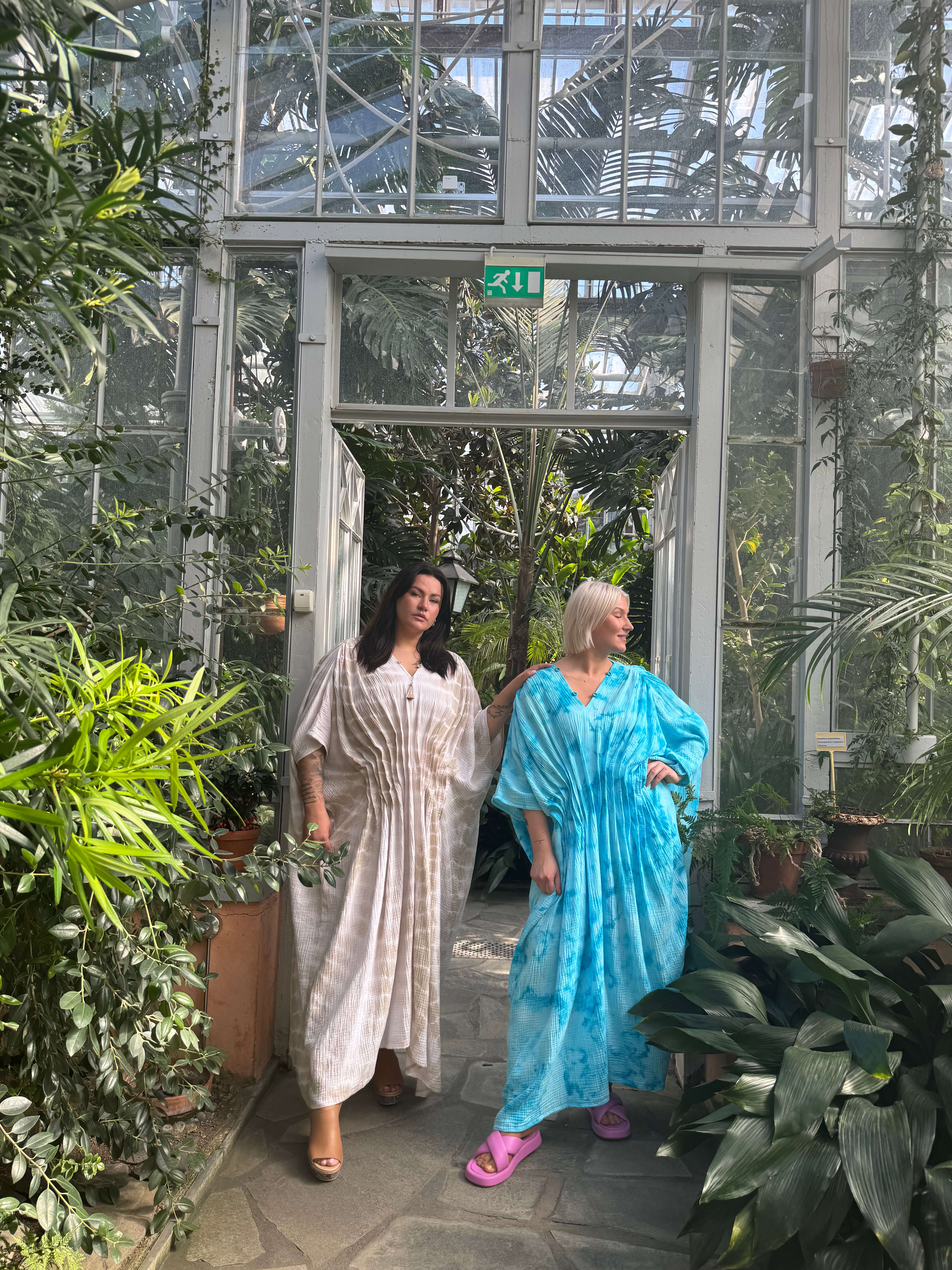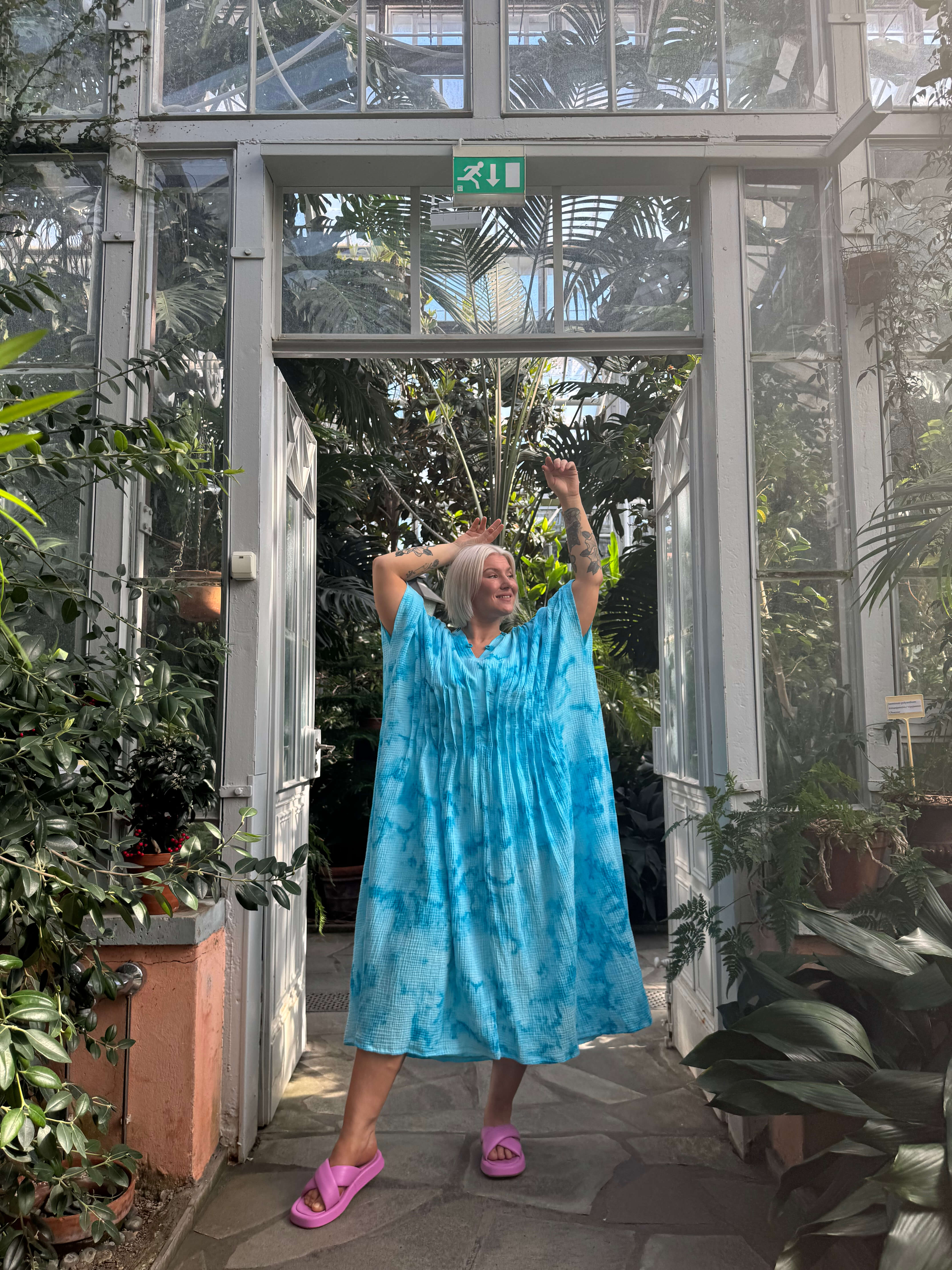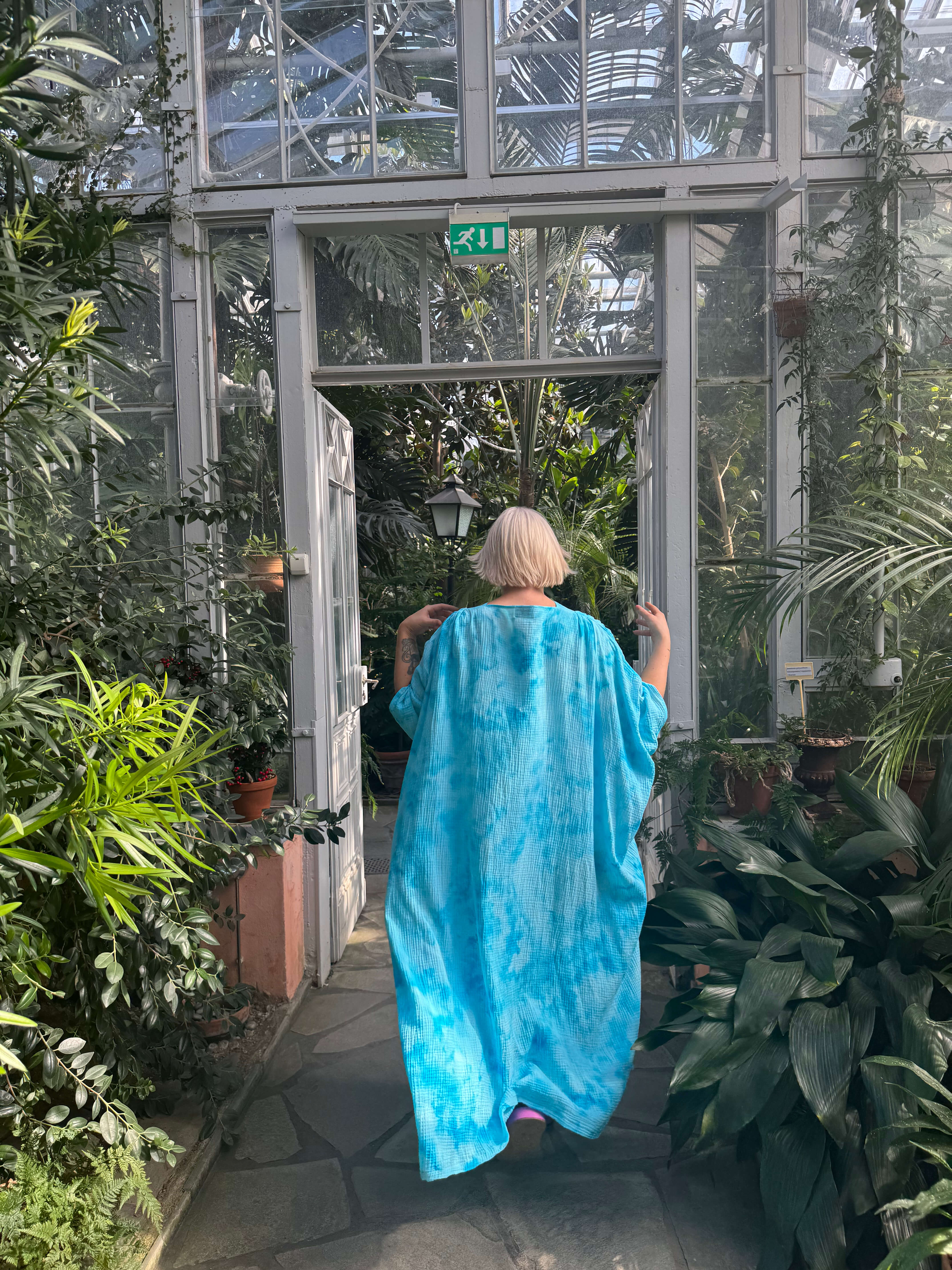Tämä väljä ja ilmava kaftaani on suunniteltu kulkemaan kanssasi arjen ja juhlan välillä. Edessä vyötäröllä olevat laskokset tuovat kauniin muodon ja ryhdin muuten rentoon siluettiin. Pehmeä musliinikangas laskeutuu kauniisti, ja jokainen kappale on käsinvärjätty – täysin uniikki.