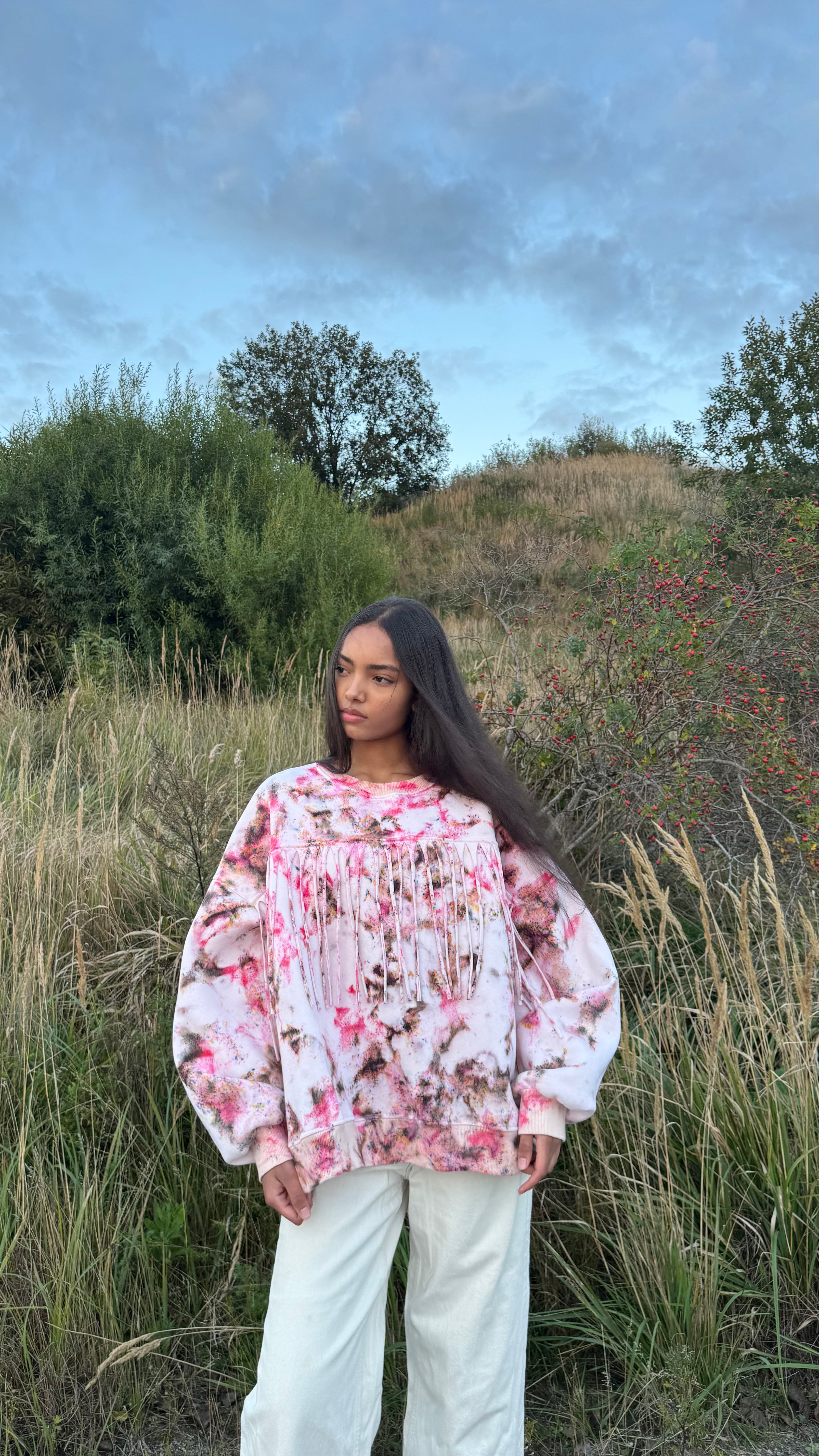• Malli: Oversized, madalletut olkasaumat, pitkät hihat, hapsuyksityiskohta